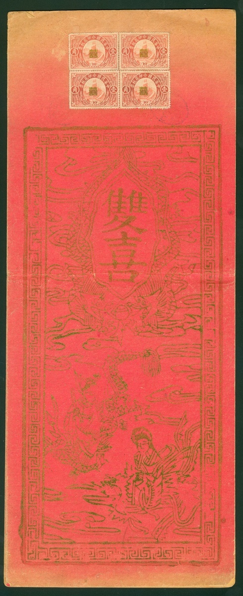 2 wedding related old documents: 1. 1910-20s the "Double Happiness" wedding dowry List of the Republic of China. The cover and back cover has woodcut pattern with gold printing. On the front with 4 x 10c. overprint golden "Double Happiness" tax stamp. 2. 1910-20s The Chinese marriage certificate, writing the list of the wedding gifts . Four (10c.) tax stamp of the Republic of China with overprint golden "Double Happiness". Rare.