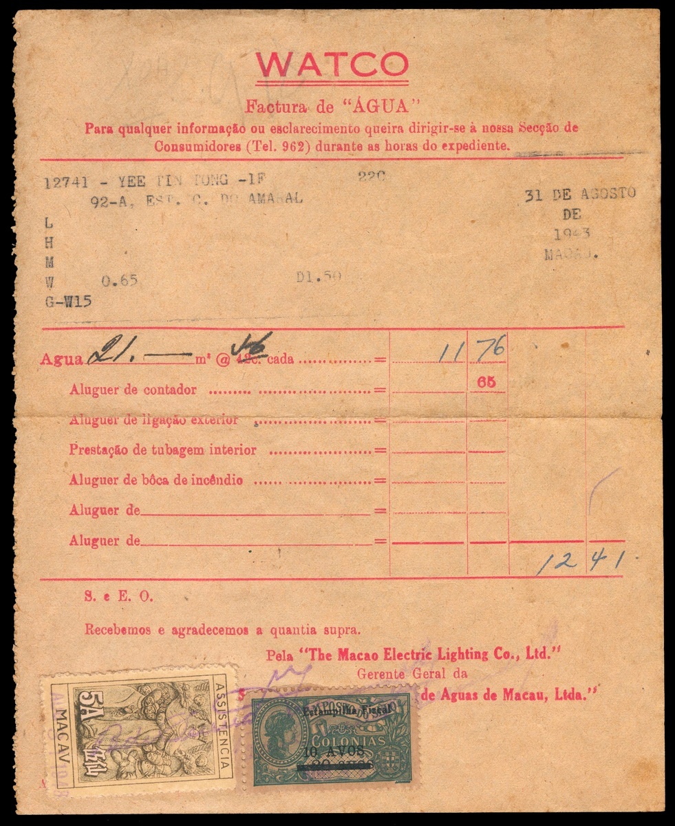 1943 Macao eight Electricity Bills, with two tax stamps for each.