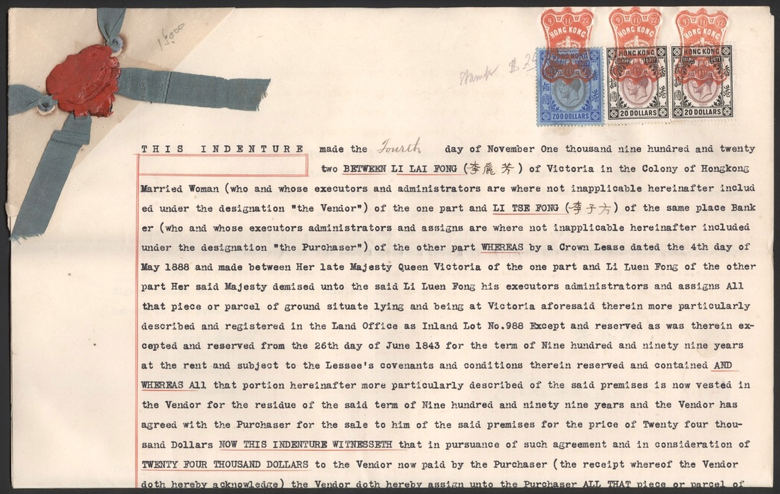 1922 (4 Nov.) A piece from indenture bearing KGV Stamp Duty $20(2) and $200, cancelled by embossed seal in red, $200 used very rare, fine.