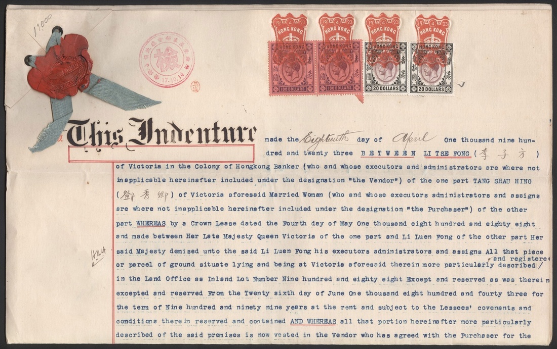 1923 (18 Apr.) A piece from indenture, recorded during the Japanese Occupation, bearing KGV Stamp Duty $20(2) and $100 pair, cancelled by embossed seals, showing Japanese Housing Registry Office red circle h/s (14.10.1942) and chop, very fine.