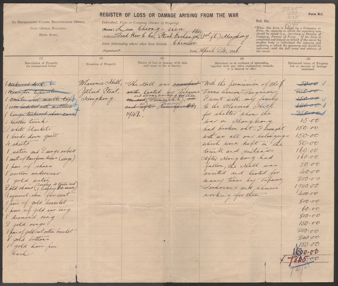 1946 (24 Apr.) Hong Kong Masonic Hall, also known as know Zetland Hall Wartime Destruction and Property Damage Report Form. Recorded by the Hong Kong Government reparations Claims Registration Office, this is one of the reconstruction documents of post-war Hong Kong.