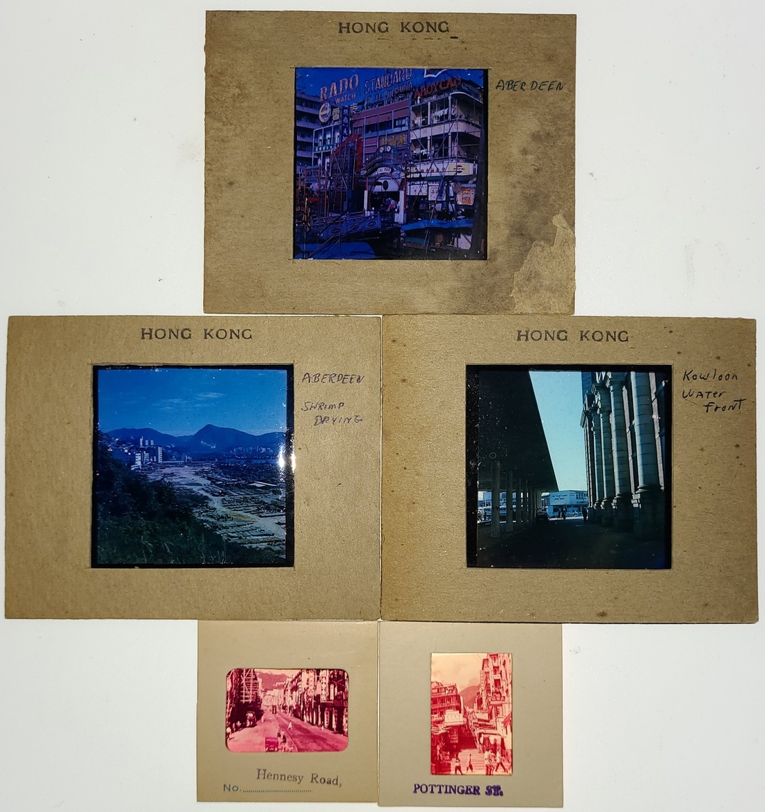 1970s three large-scale slides in Hong Kong, with the sceneries of Aberdeen and Tsim Sha Tsui, plus two small slides of Pottinger Street and Hennessy Road.