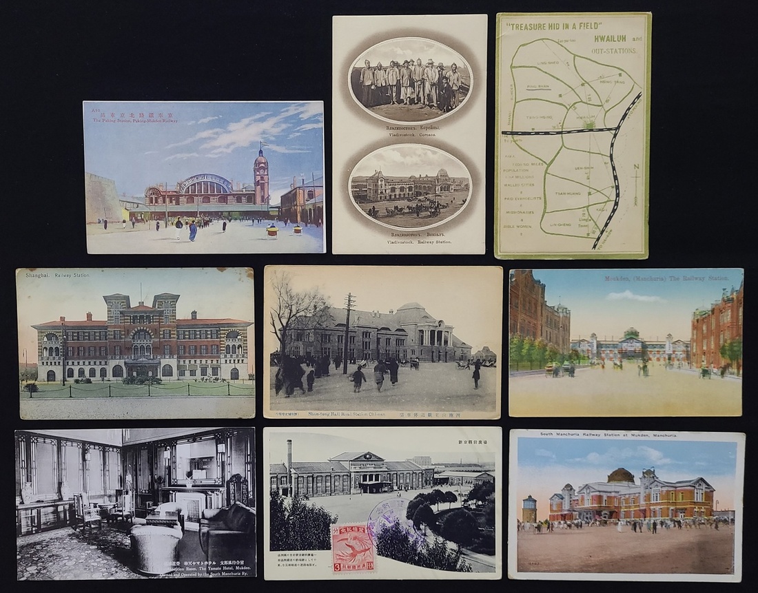 1910-30 small group of eight railway stations and one railway map including Moukden, Shanghai, Peking and Chinan