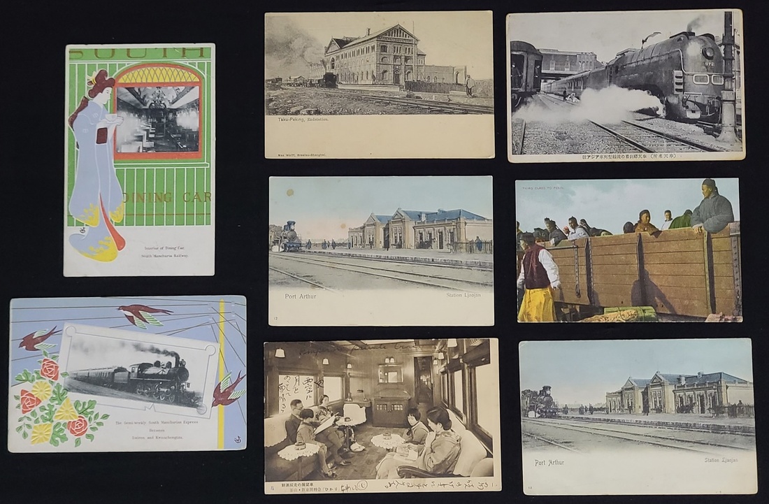 1910-30 small group of eight train picture postcards including Peking ,Taku, Port Arthur, Moukden and South Manchuria.