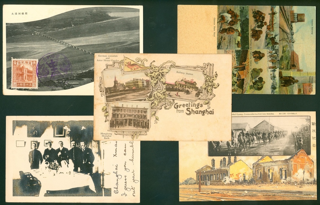 清代民國圖畫明信片5件,內容為外國駐華使節合影,上海著名建築火車站,民俗,日軍馬隊等,其中一件貼偽滿紀念郵票並銷紀念戳,整體保存完好