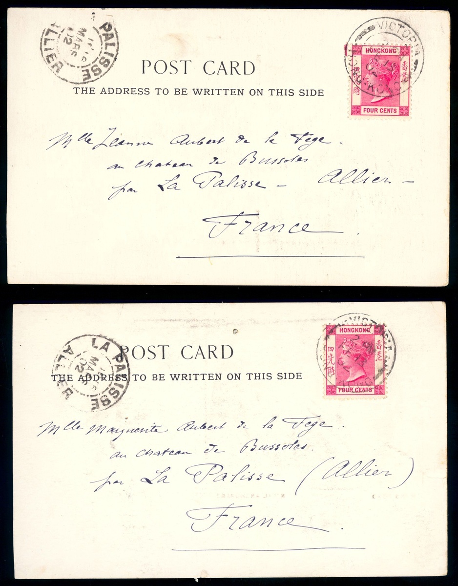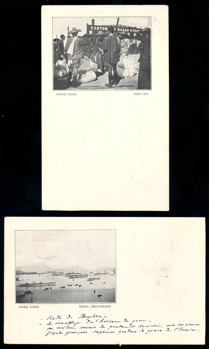 1902年香港早期明信片两枚; 一為廣澳汽輪碼頭前苦力,另一為海港上的戰艦. 两明信片皆寄往法國.