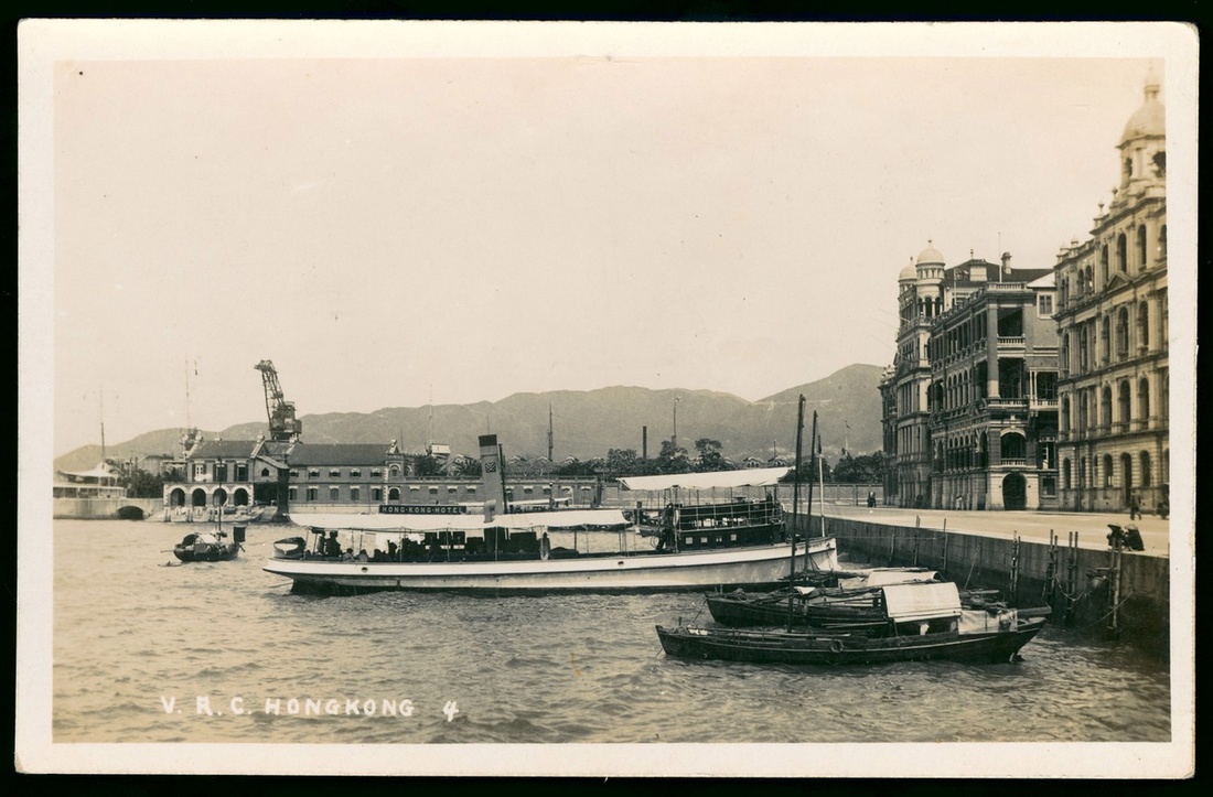 1920年代中環海傍實照明信片,停泊了屬於香港酒店的船隻,遠處為維多利亞遊樂會(Victoria Recreation Club) 及海軍船塢.