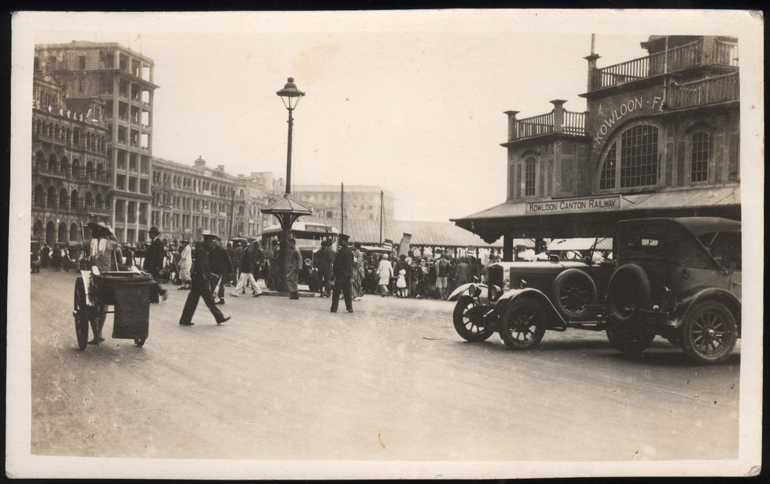 1920s the real photo postcard of the Star Ferry Pier on Hong Kong Island, the bus to Happy Valley can be seen in the picture.
