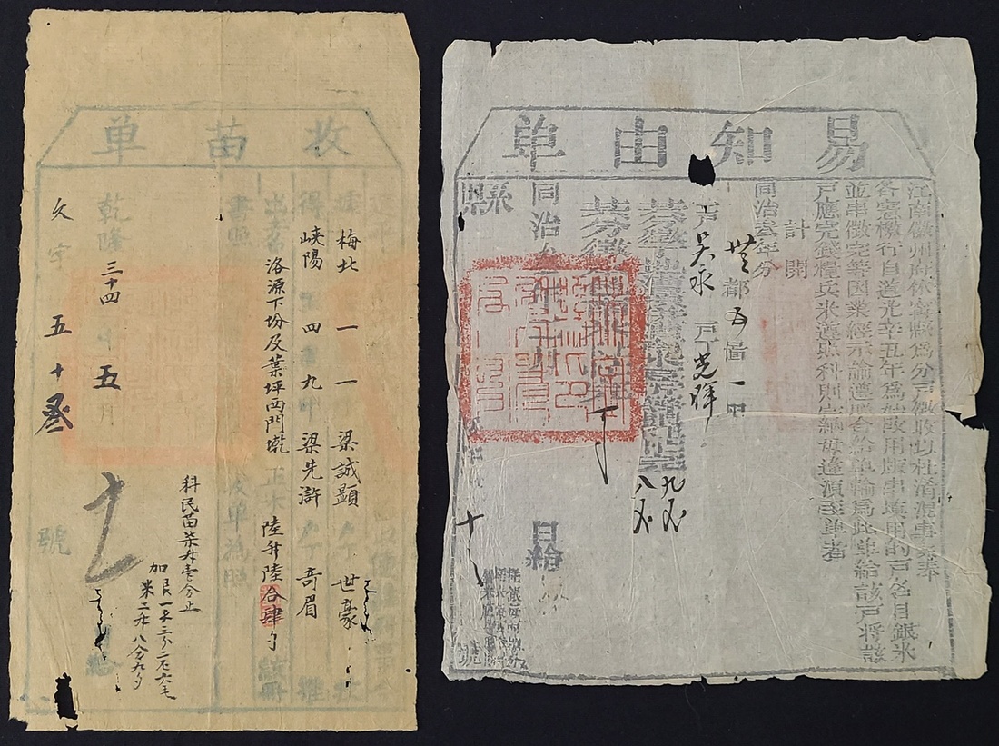 1769年 (乾隆三十四年) 南平縣税單 (牧苗單) 及1864年 (同治三年) 徽州府税單 (易知由單) 各一份.