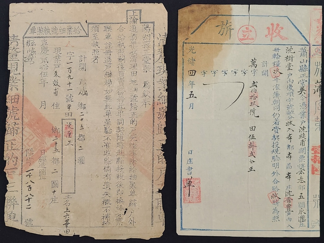 1820 a sheet of the local tax license of Yanghu County (Jiangsu Province), and 1878 a sheet of the grain tax receipt of Xiaoshan County (Zhejiang Province).