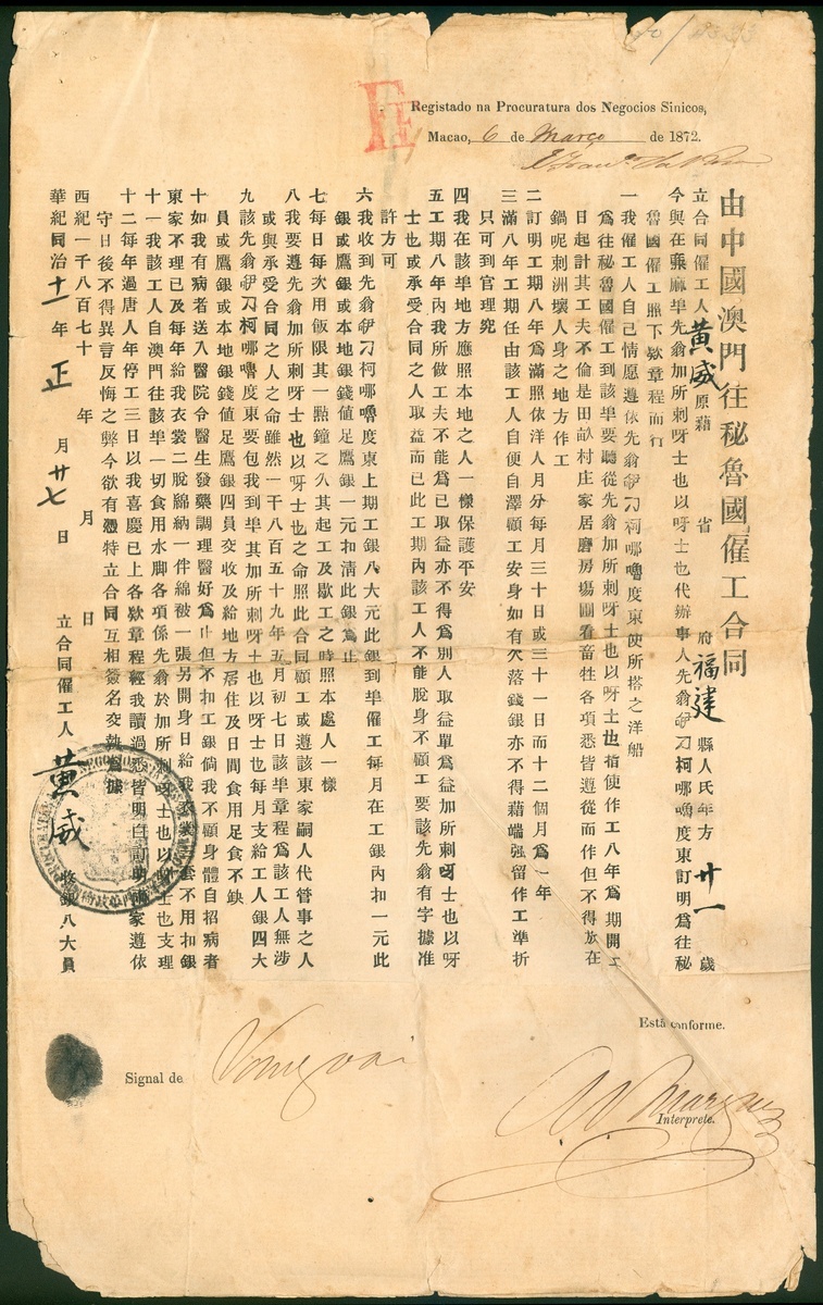 1872 (6 Mar.) "A contract of Hiring Workers from Macau, China to Peru". The text is published in Chinese and Portuguese. In addition to the signature of the employer's agent and the employee"s fingerprint in the contract of the employee, The official Macau signature and the "Atlantic Macau Chinese Yamen" seal are still required for verification; This contract has been preserved for nearly 150 years. Although there are some damage, it is still a rare document. It is a precious document for studying the overseas labor of the Qing Dynasty.