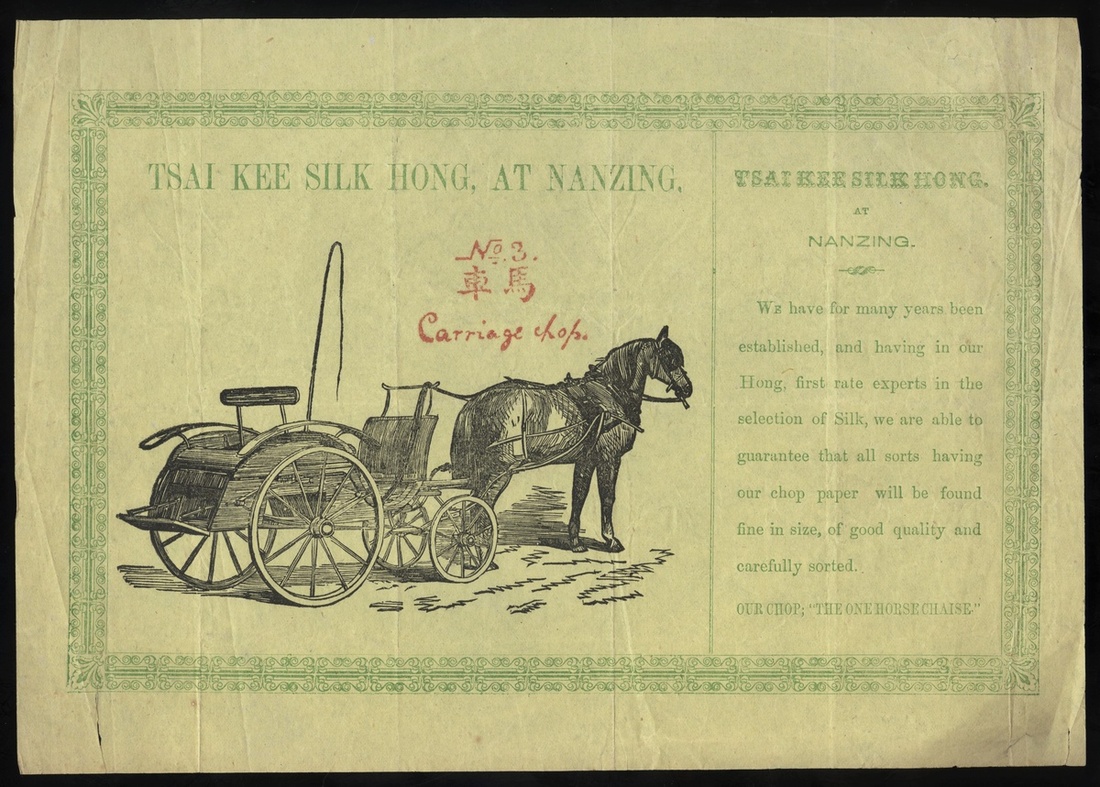 1890-1900s Nanzing Tsai Kee silk Hong (shop) leaflet with the engraving of the business chop of "carriage" image on it.