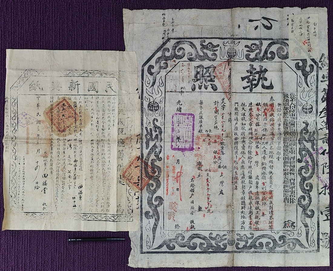 光緒三十三年 (1907) 奉天省綏中縣土地課税執照一份附貼民國三年奉天國税廰籌備處契紙