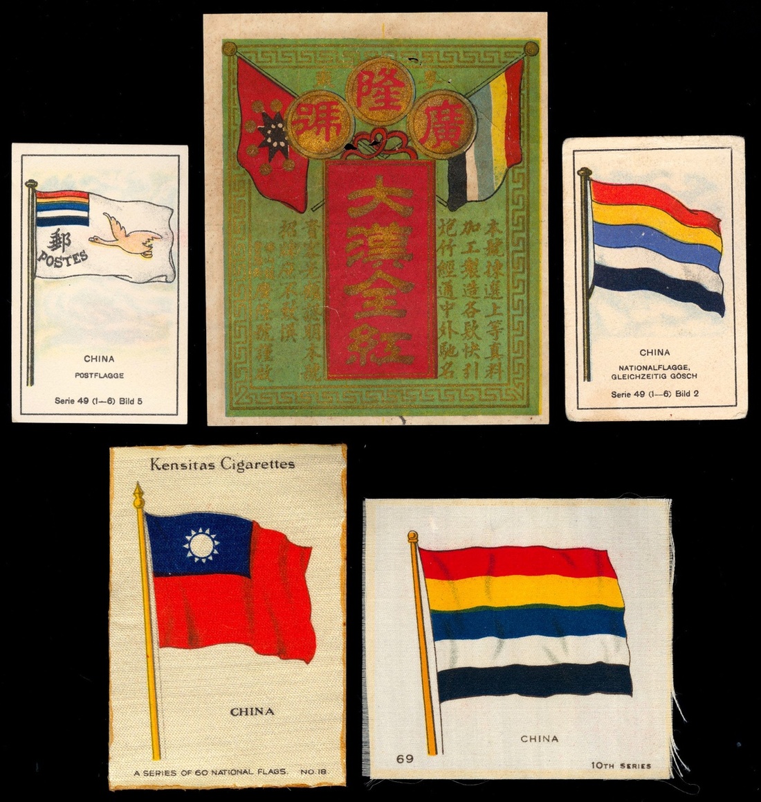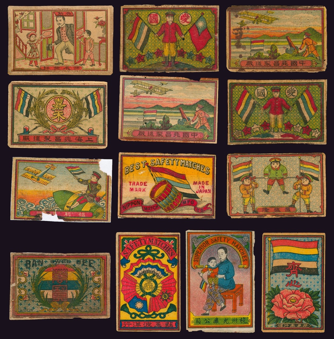 1910-1920年代民國初年以國旗為圖案的火柴盒貼紙13枚,廣告招紙兩枚,布質及紙質小卡五枚,另附民初罕見火柴盒貼紙影印24枚.
