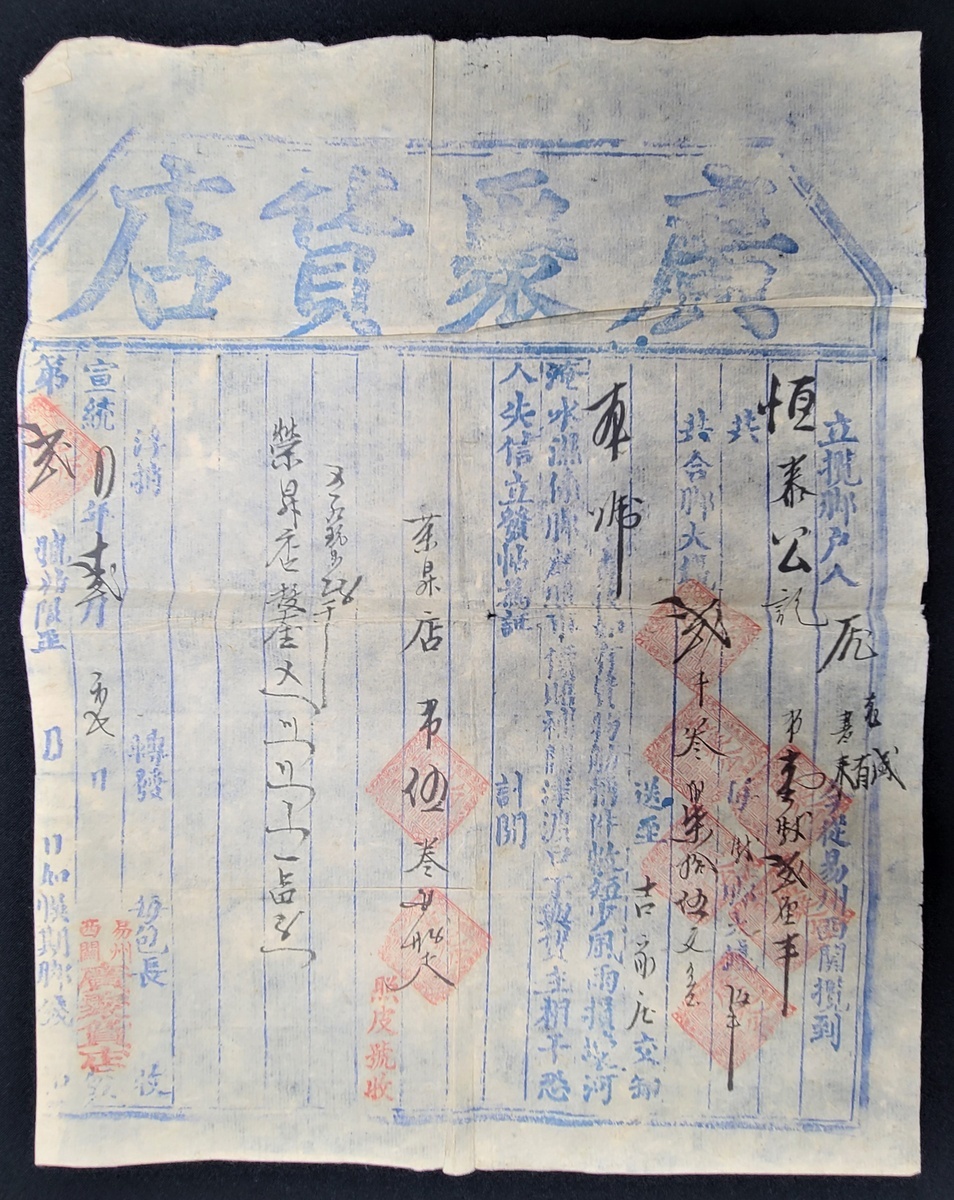 1912 (宣統四年,亦即民國元年) 直隸易州廣聚貨店保險單據一份.
