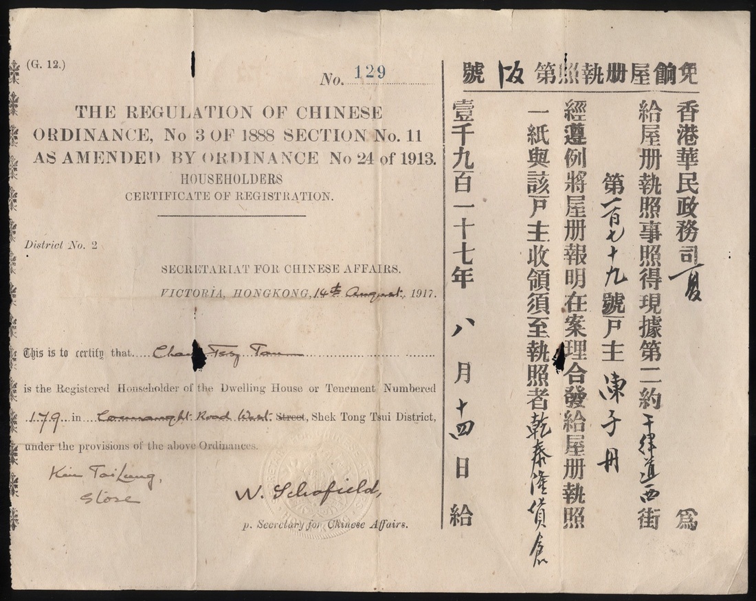 1917 (14 Aug.) No. 129 of the Rate-Free Housing Register License issued by the Secretary for Chinese Affairs in Hong Kong. Printed in both Chinese and English. A steel seal of "Secretary For Chinese Affairs/ Hong Kong" is stamped.