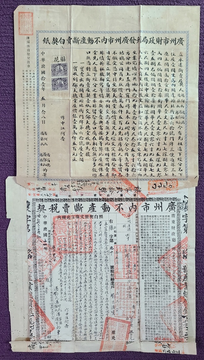 1922 a set of the real estate sales deed in Guangzhou issued by the Guangzhou Municipal Bureau of Finance, A map of the location of Guangzhou Xiguan Real Estate is attached.