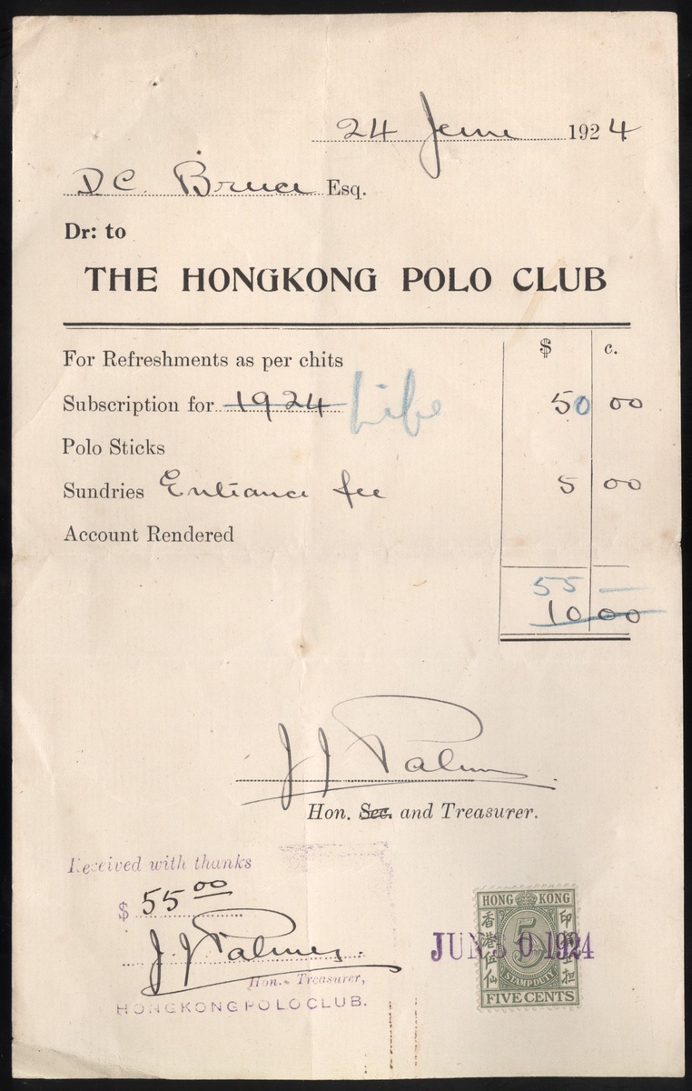 1924 (24 June) a rare receipt for The Hong Kong Polo Club, well kept.