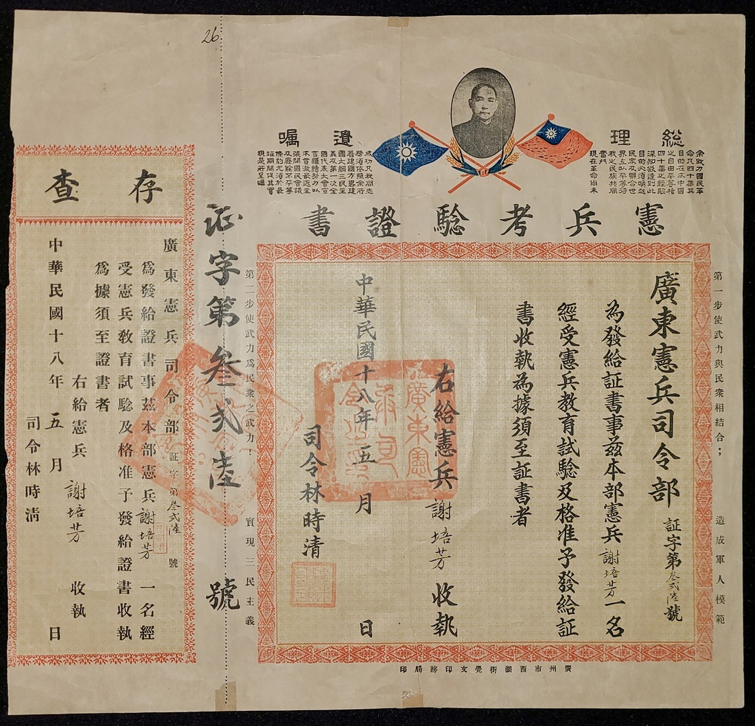 1929年5月 (民國十八年) 憲兵考驗証書連存查一套; 由廣東憲兵司令部發給. 蓋有"廣東憲兵司令之印" 大印鑑. 証書背面有修繕. 尺寸: 34x36cm