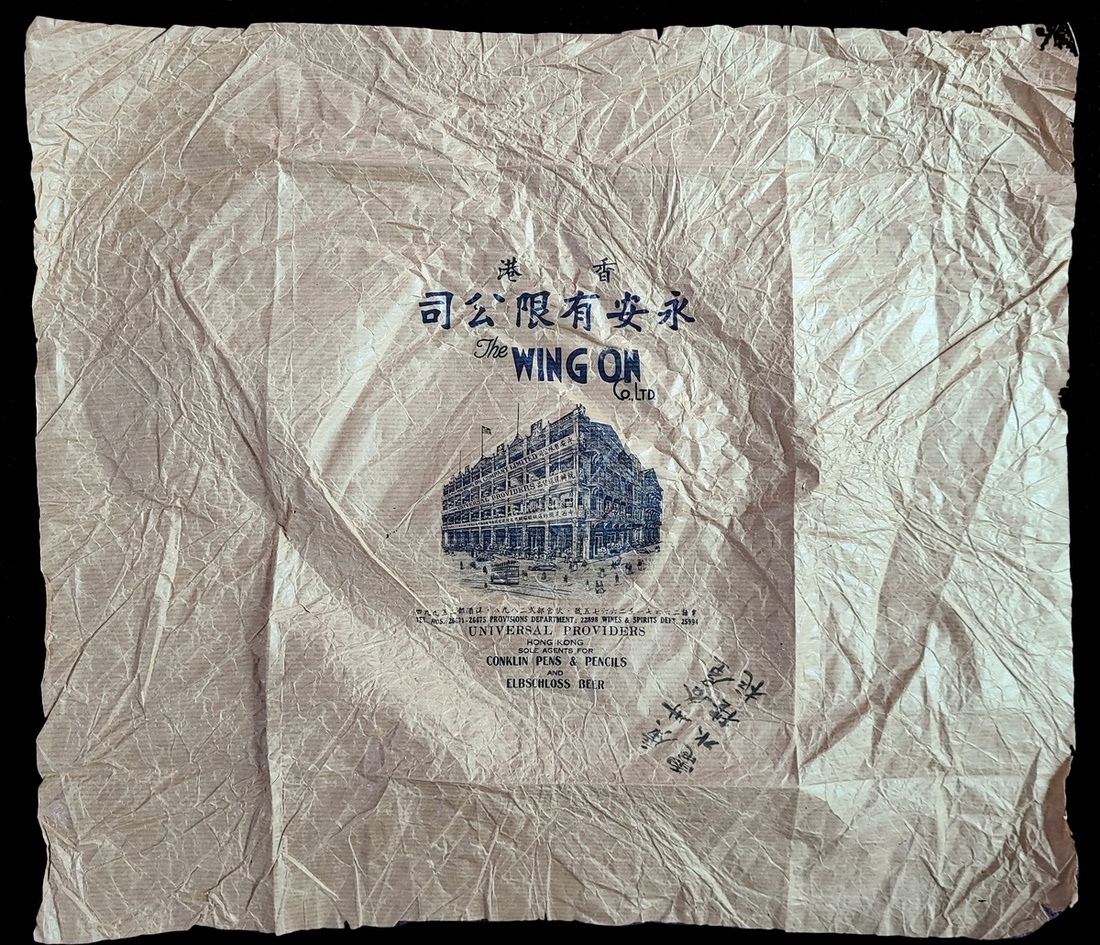 1930-1940s a piece of wrapping paper of Hong Kong Wing On Co., Ltd., with the engraved portrait of Hong Kong Wing On Department Store on it.