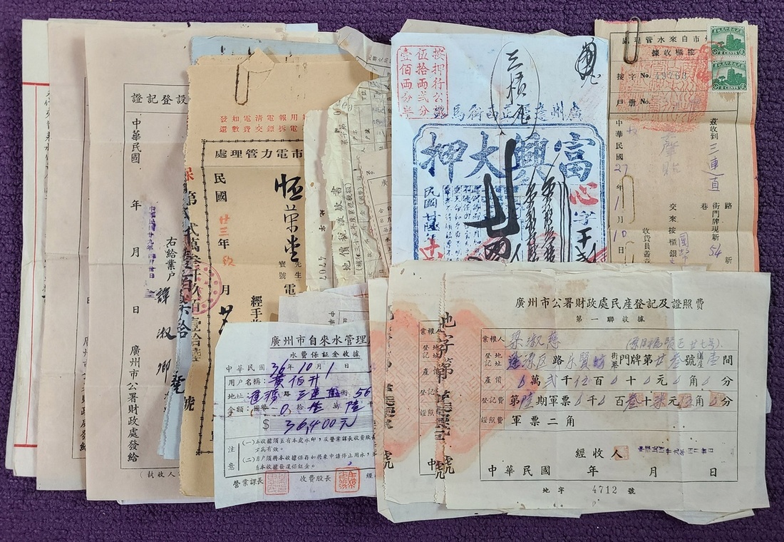 1930-1940s Guangzhou electricity bills, water bills and other receipts, including the civil property registration fee paid with military bills when Guangzhou fell. Some of them were affixed with tax stamps. More than thirty pieces in total.