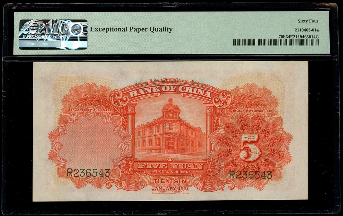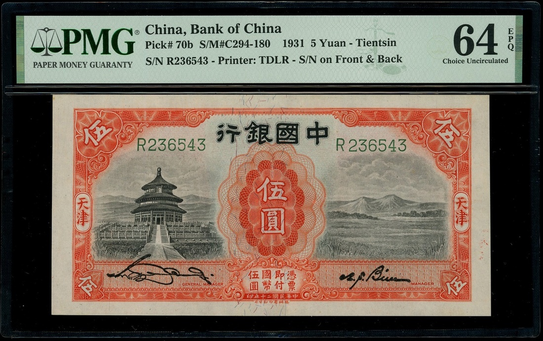 民國二十年(1931)中國銀行伍圓,天津地名,編號R236543,評PMG 64EPQ