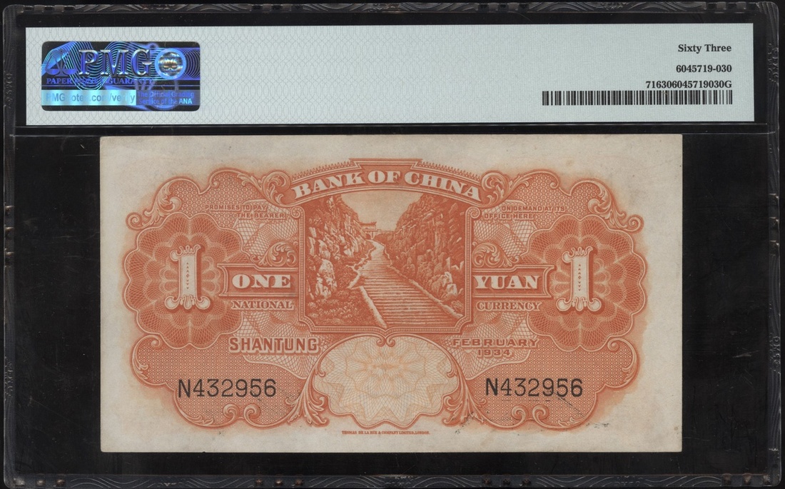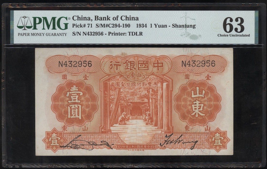 民國二十三年中國銀行壹圓,山東地名,編號N432956,PMG 63