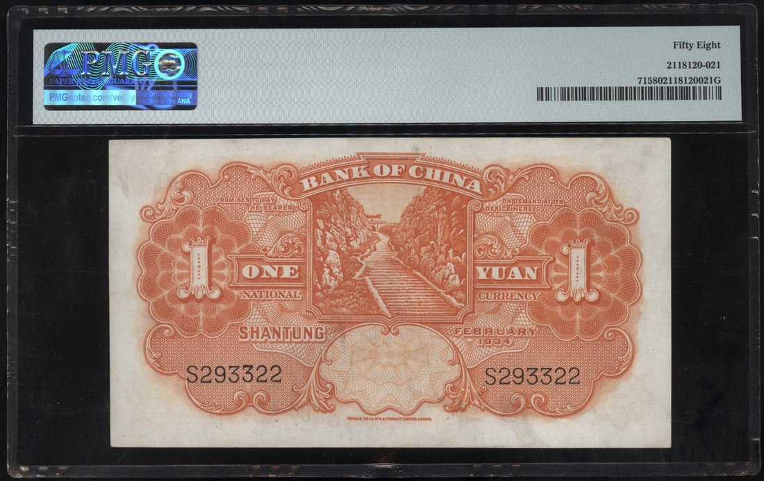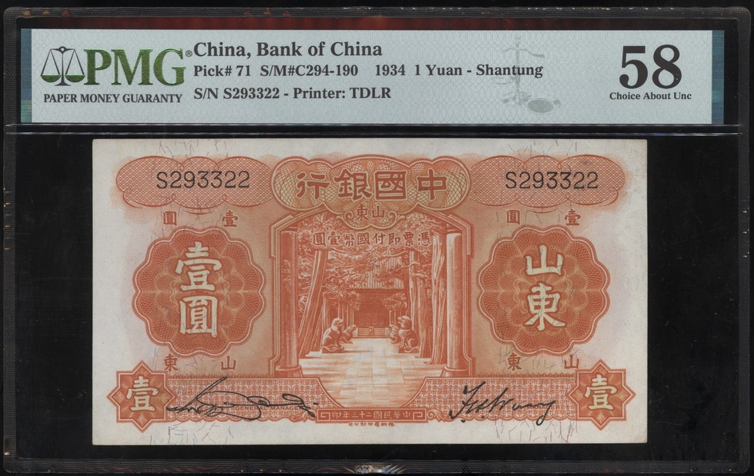 民國二十三年中國銀行壹圓,山東地名,編號S293322,PMG 58