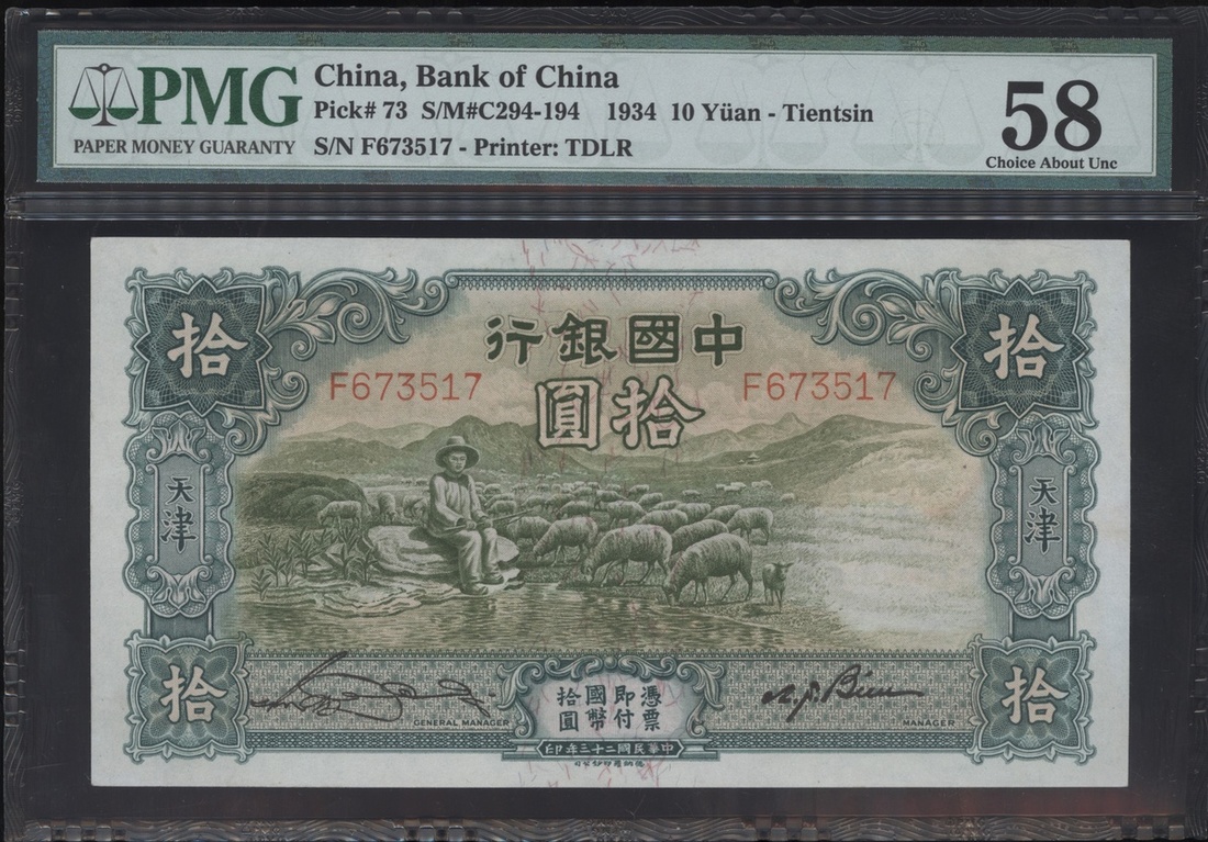 Bank of China, 10 Yuan, 1934, Tientsin, serial number F673517, green and multicoloured, sheep farming scene at centre, (Pick 73), PMG 58 Choice About Uncirculated