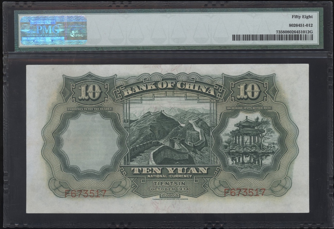 民國二十三年中國銀行拾圓,天津地名,編號F673517,PMG 58