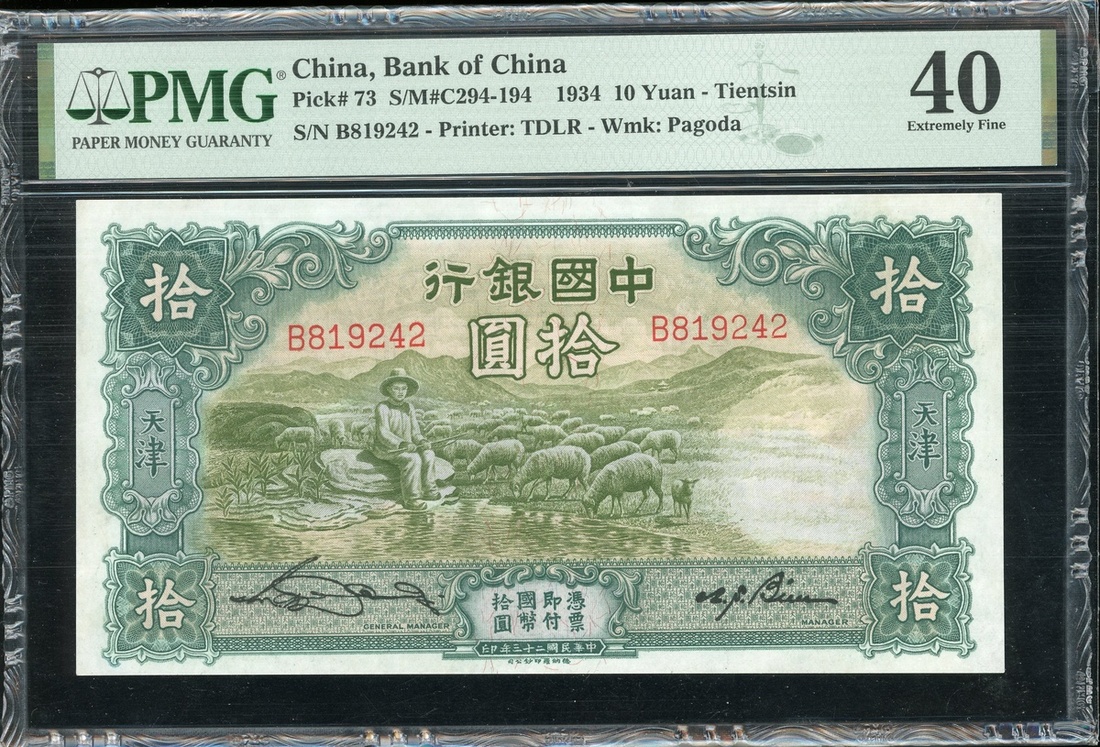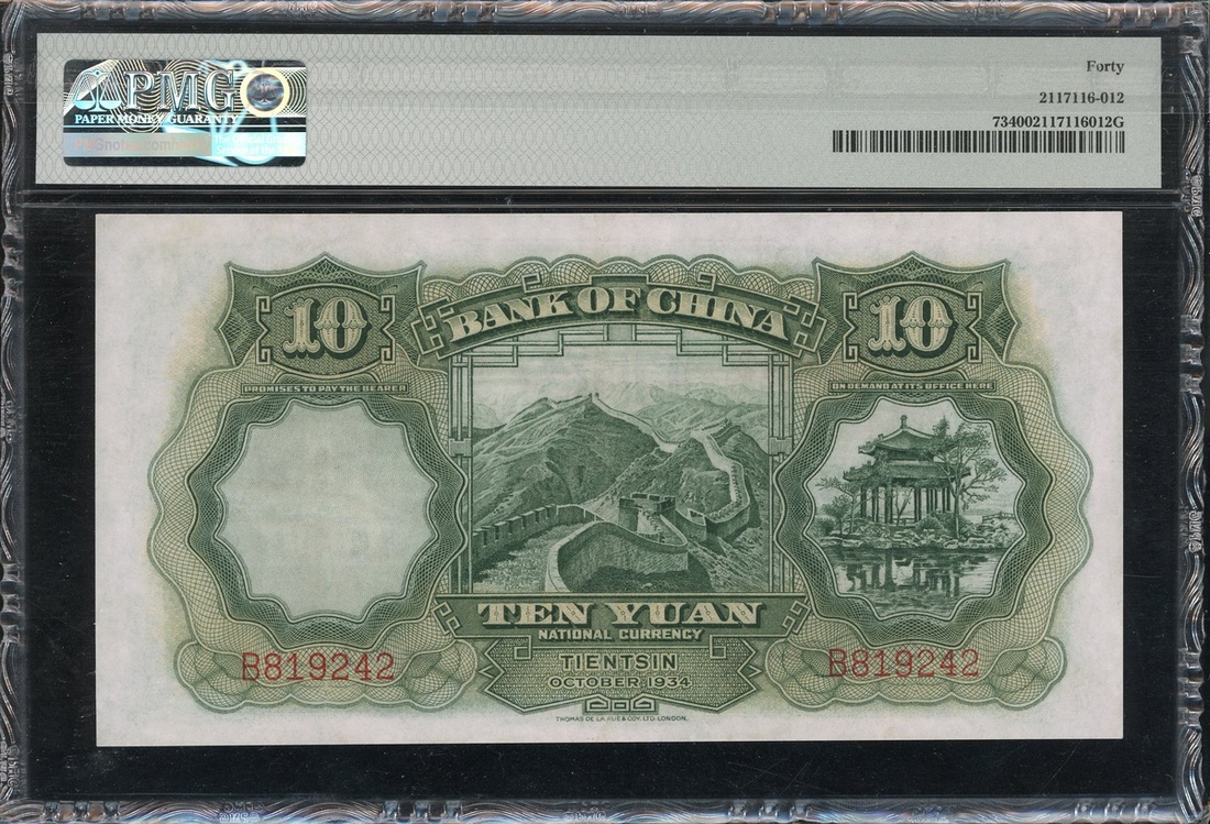 民國二十三年中國銀行拾圓,天津地名,編號B819242,PMG 40
