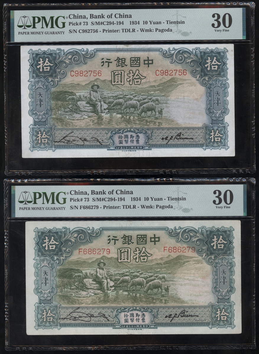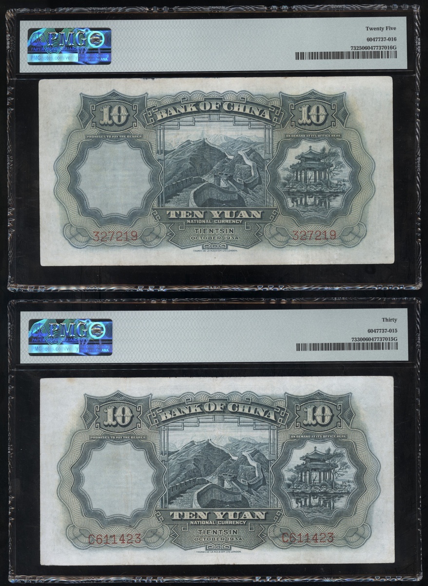 民國二十三年中國銀行拾圓一組四枚,天津地名,編號327219,C611423,C982756及F686279,PMG 25-30