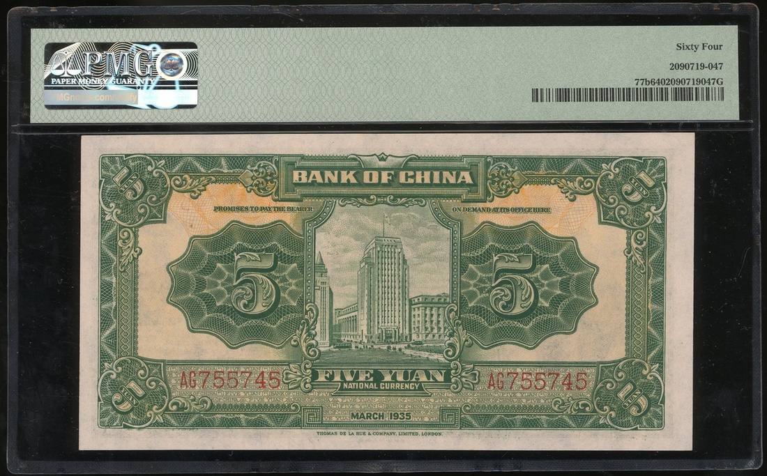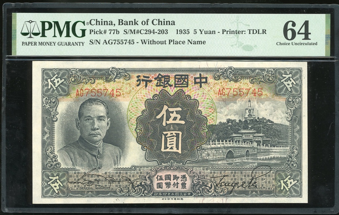民國二十四年(1935)中國銀行伍圓,無地名,編號AG755745,PMG 64