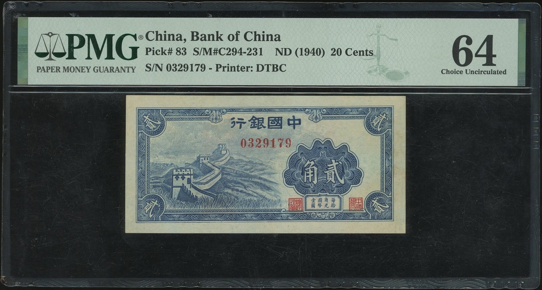 1940年中國銀行貳角,編號0329179,PMG 64