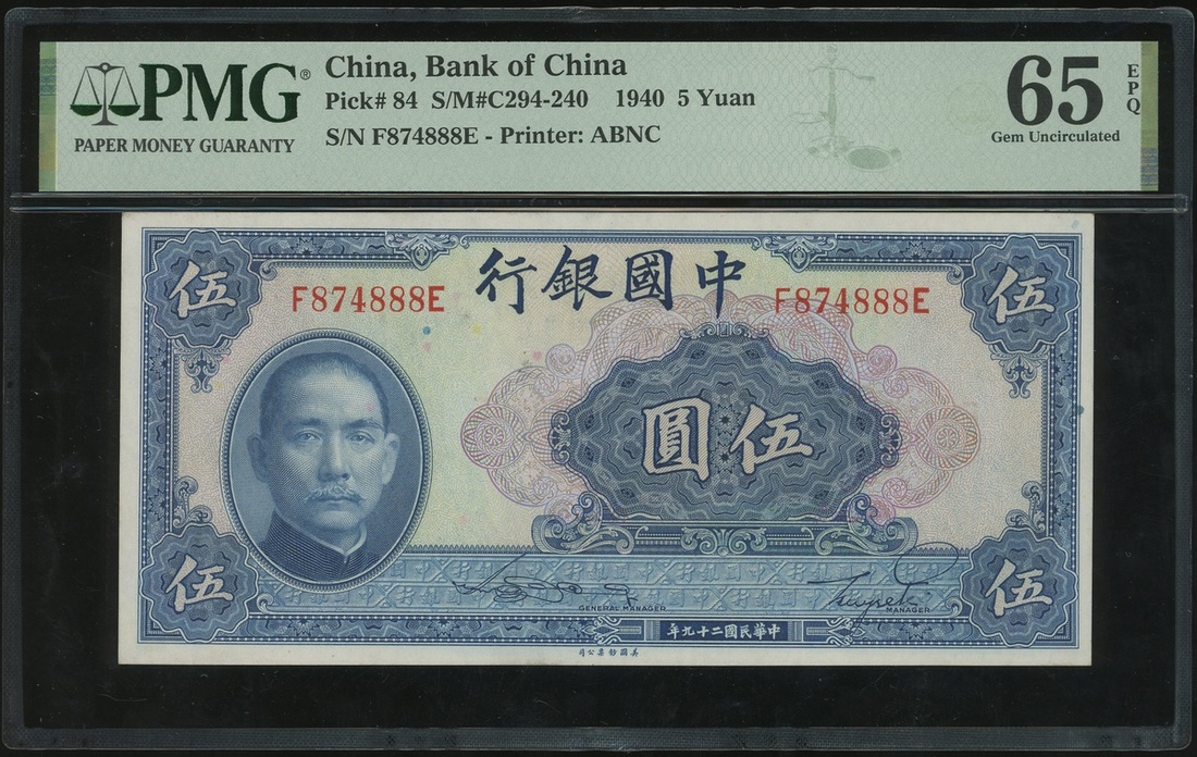 民國二十九年(1940)中國銀行伍圓,豹子號F874888,PMG 65EPQ