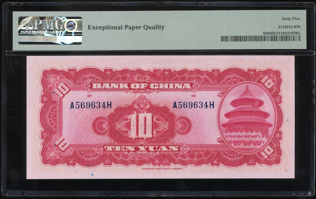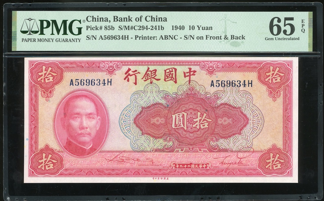 Bank of China, 10 yuan, Year 29(1940), consecutive serial numbers A569634H-35H, (Pick 85b), both graded PMG 65EPQ Gem Uncirculated (2).