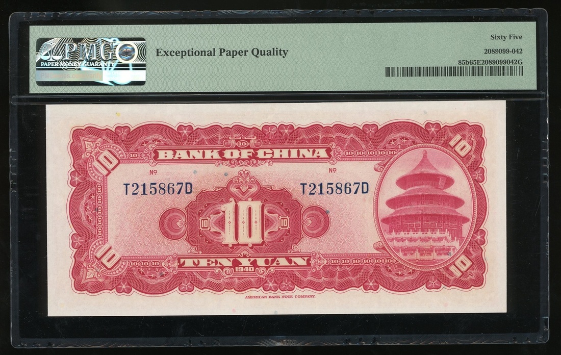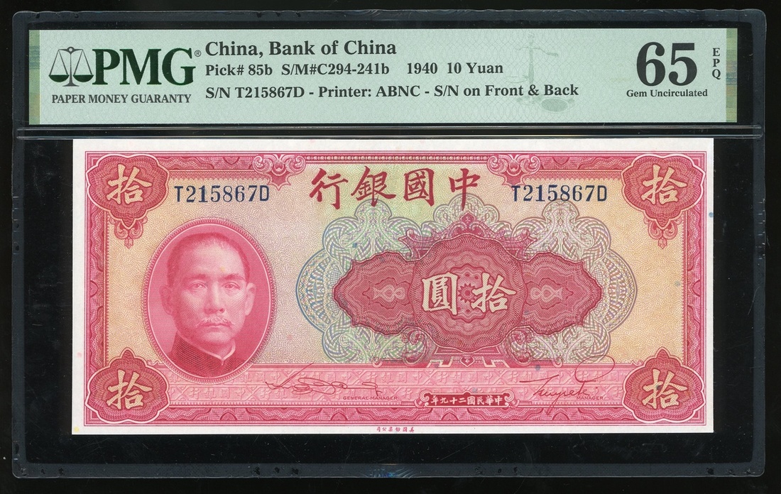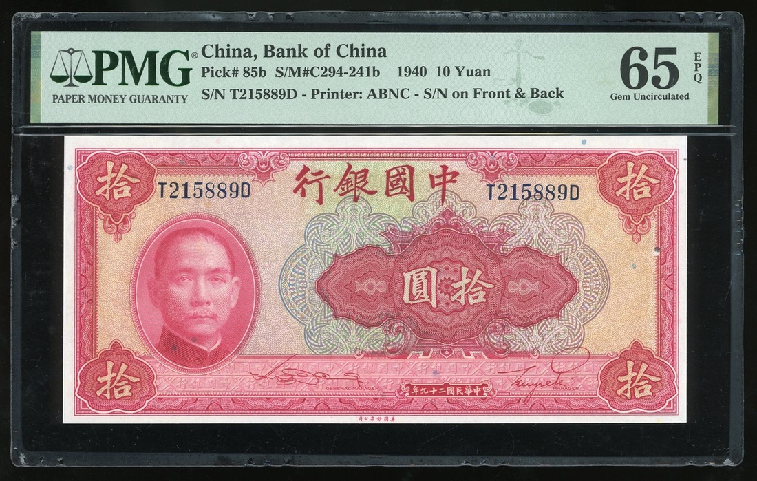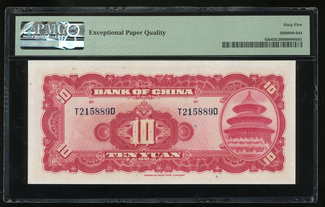民國二十九年(1940)中國銀行拾圓一對,編號T215867D及T215889D,均評PMG 65EPQ