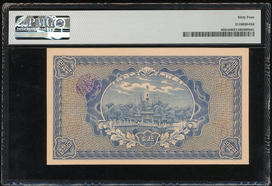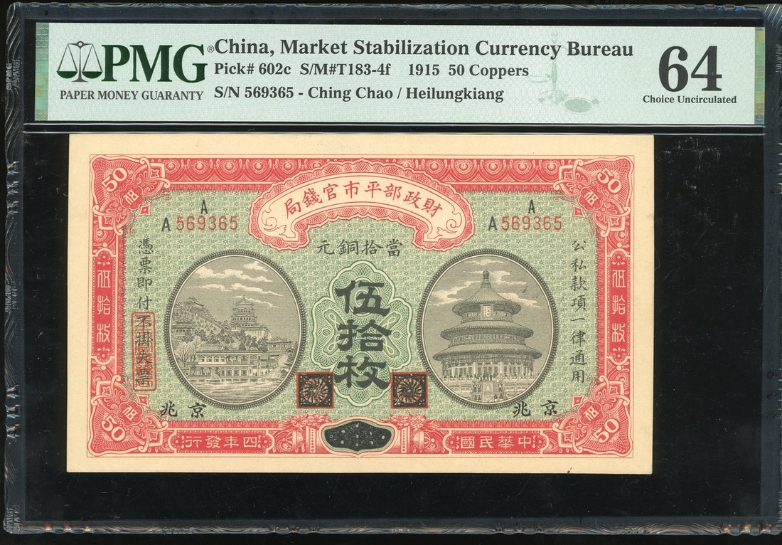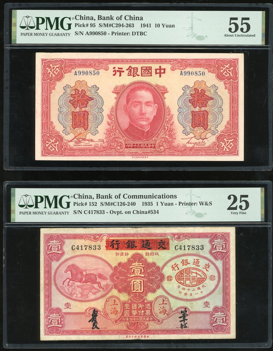 Republic of China, group of 3, consisting of: Bank of China, 10 yuan, Year 30 (1941), serial number A990850, Bank of Communications, 1 yuan, Year 24 (1935), overprinted on The National Industrial Bank of China, serial number C417833 and Market Stabilization Currency Bureau, 50 coppers, Ching Chao/Heilungkiang, Year 4 (1915), serial number 569365, (Pick 95, 152, 602c), graded PMG 55 (Previously Mounted), 25 and 64 respectively (3)