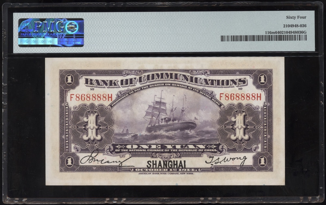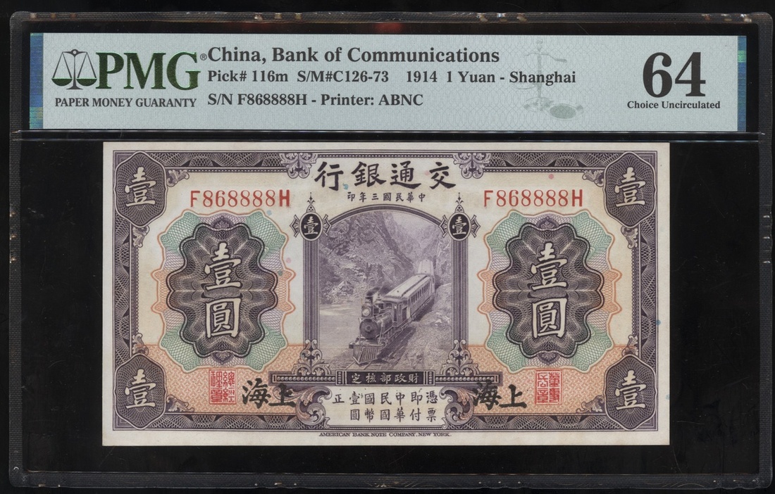 民國三年交通銀行壹圓,上海地名,編號F868888H,PMG 64