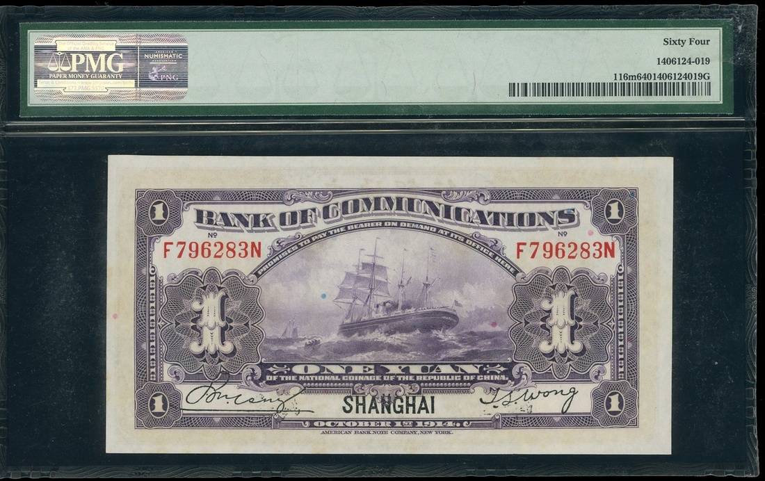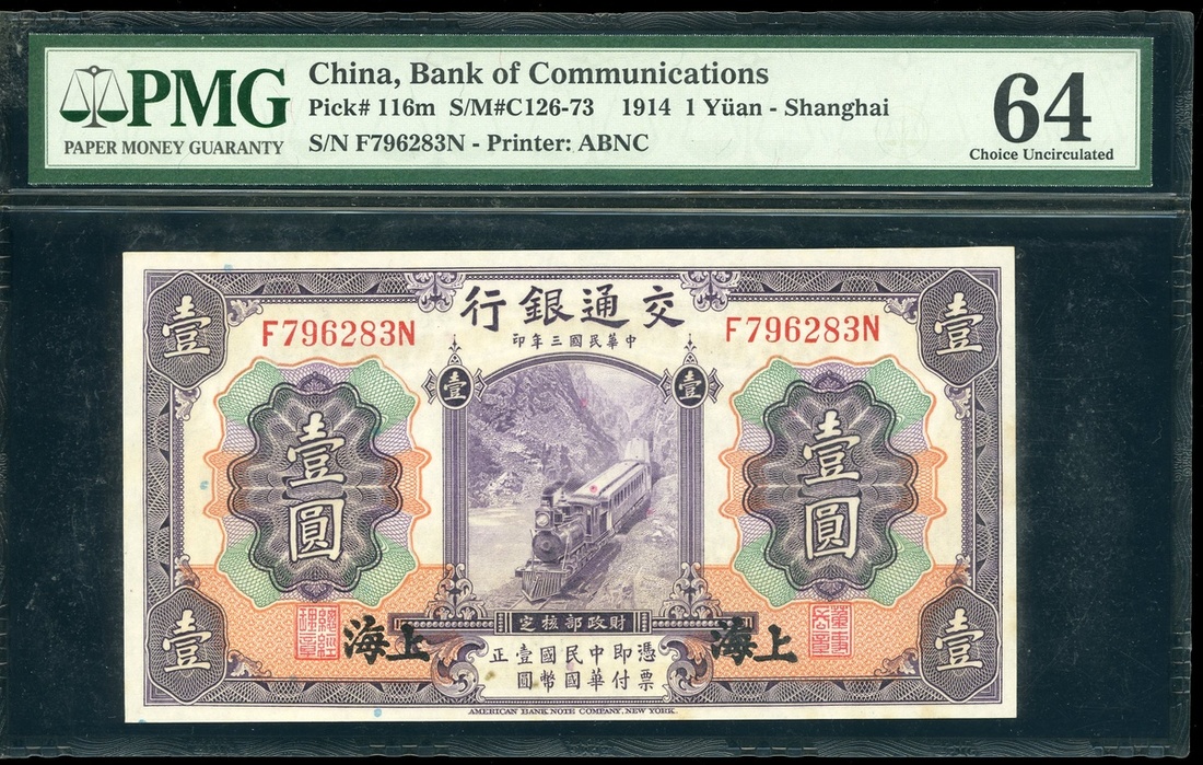 民國三年(1914)交通銀行壹圓,上海地名,編號F796283N,PMG 64