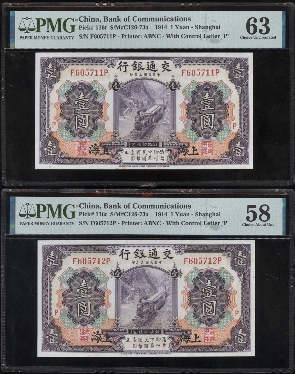 民國三年交通銀行壹圓兩枚連號,上海地名,加蓋P字版,編號F605711P-F605712P,均PMG 58-63(2)