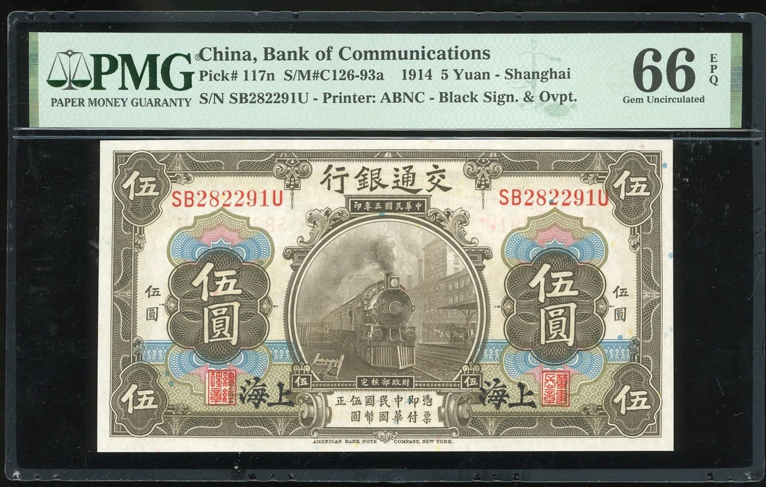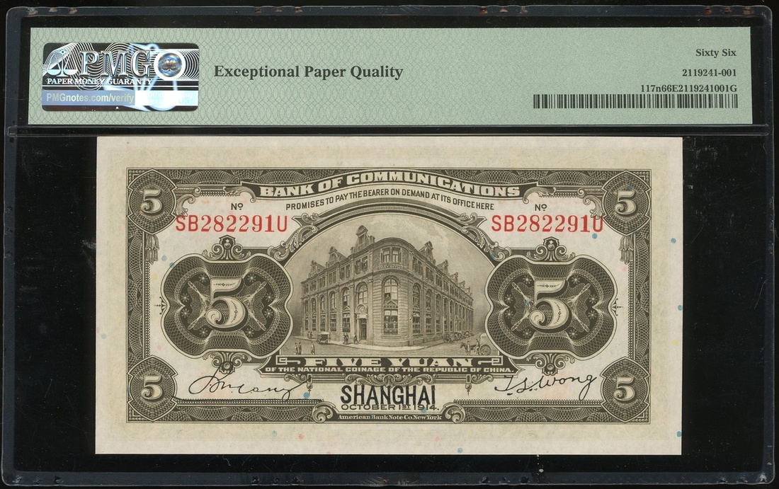 Bank of Communciations, 5 yuan, Shanghai, Year 3(1914), serial number SB282291U, (Pick 117n), PMG 66EPQ Gem Uncirculated.