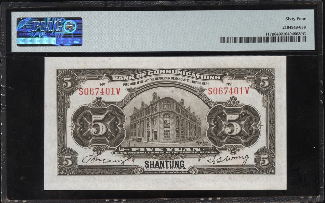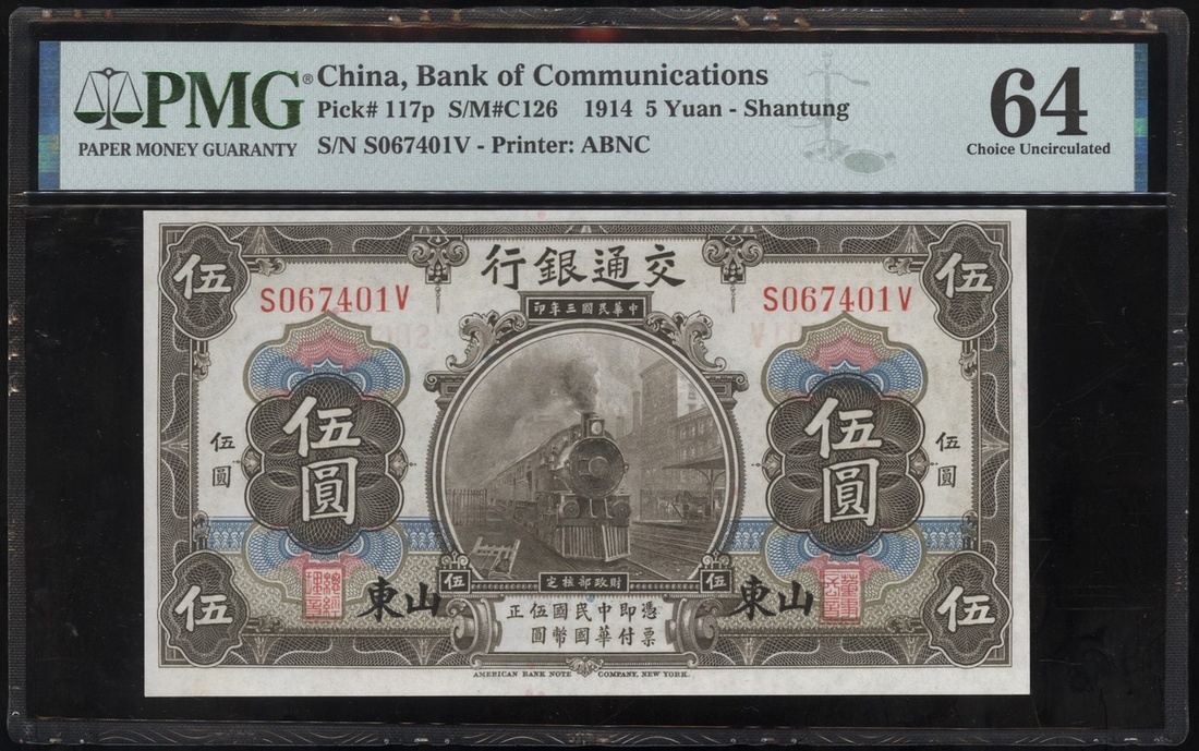 民國三年交通銀行伍圓,山東地名,編號S067401V,PMG 64