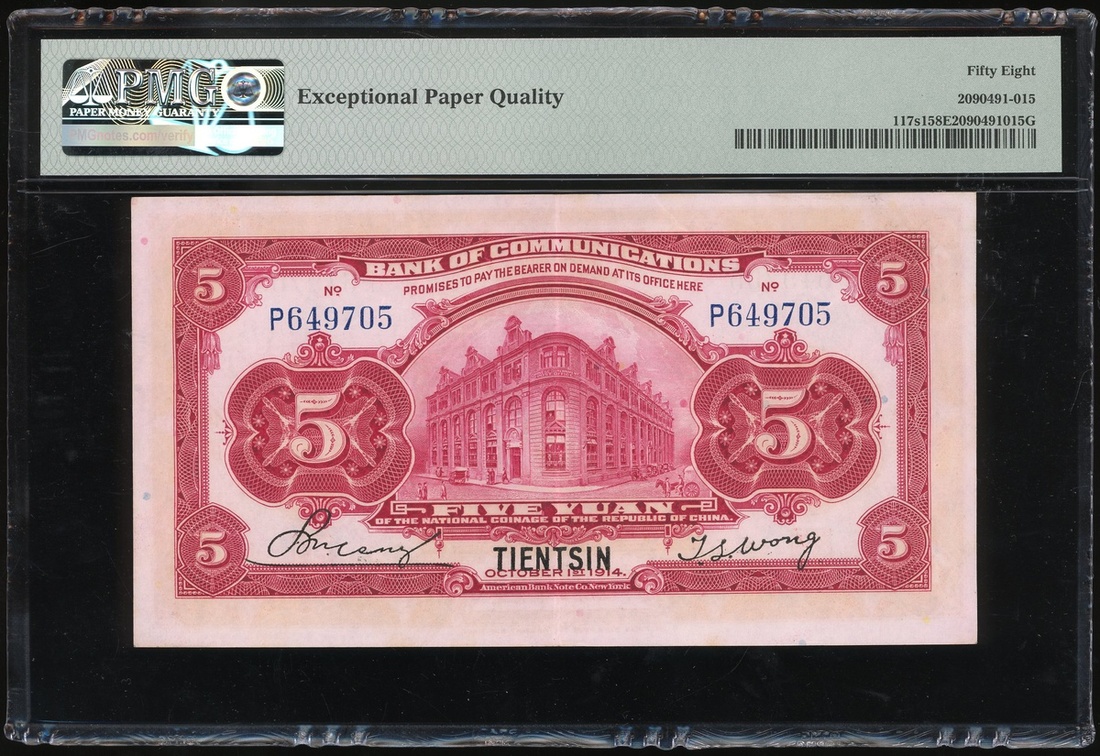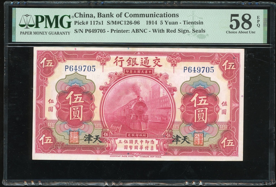 民國三年(1914)交通銀行伍圓,天津地名,編號P649705,PMG 58EPQ