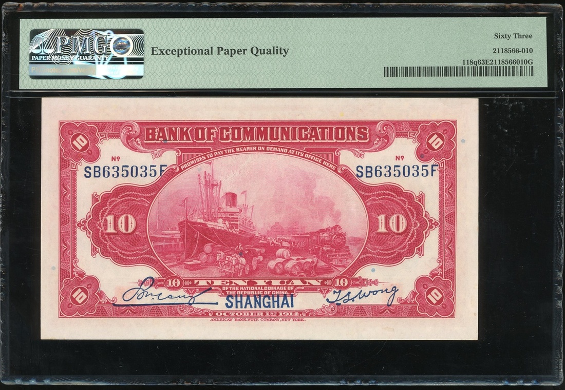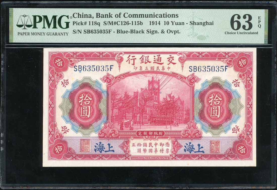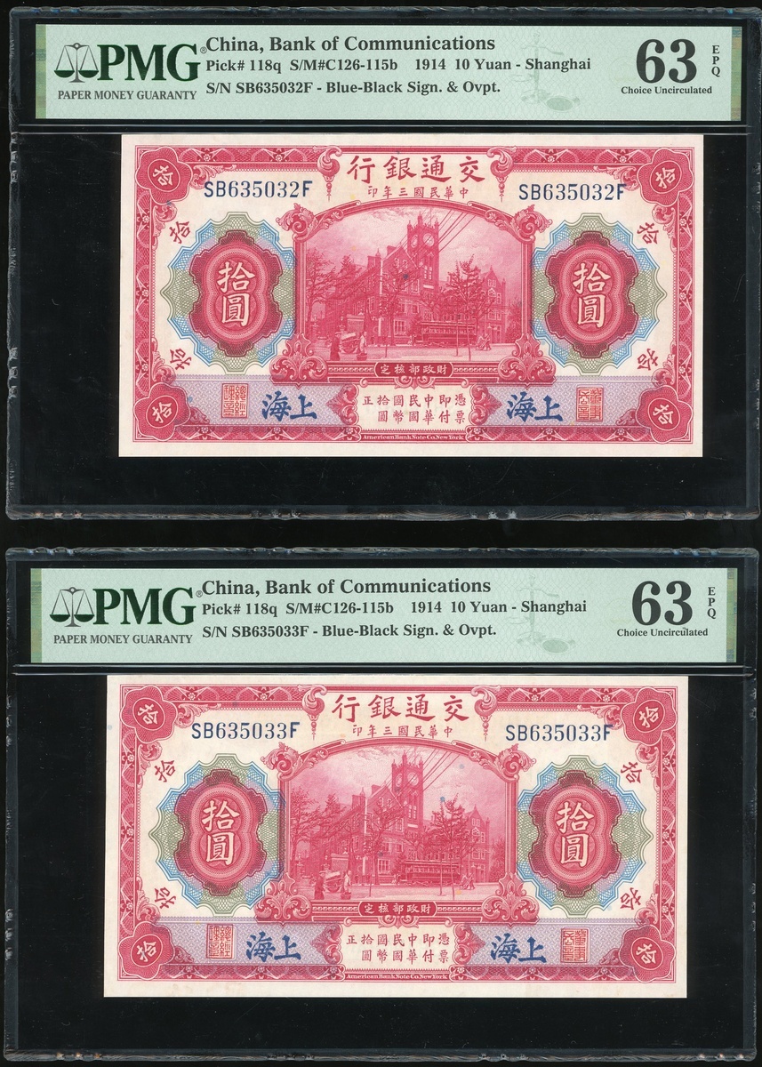 Bank of Communications, a group of 3x 10 Yuan, Shanghai, Year 3 (1914), close serial numbers SB635032-033F and 035F, (Pick 118q), all graded PMG 63EPQ Choice Uncirculated (3)