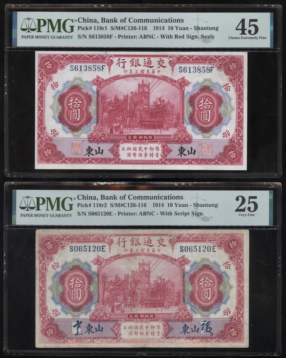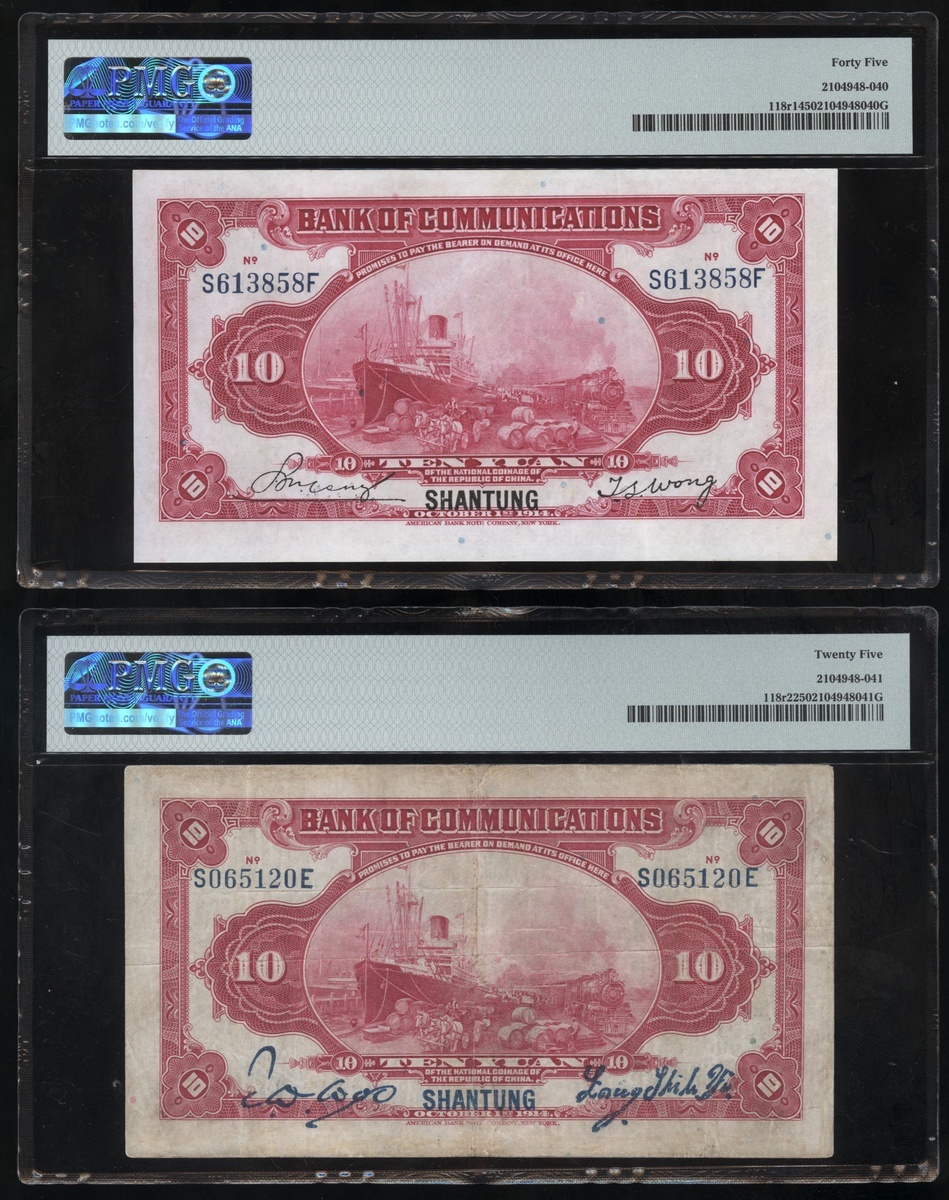 民國三年交通銀行拾圓一組兩枚,山東地名,機簽及手簽版,編號S613858F及S065120E,PMG 25-45