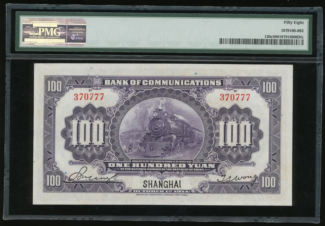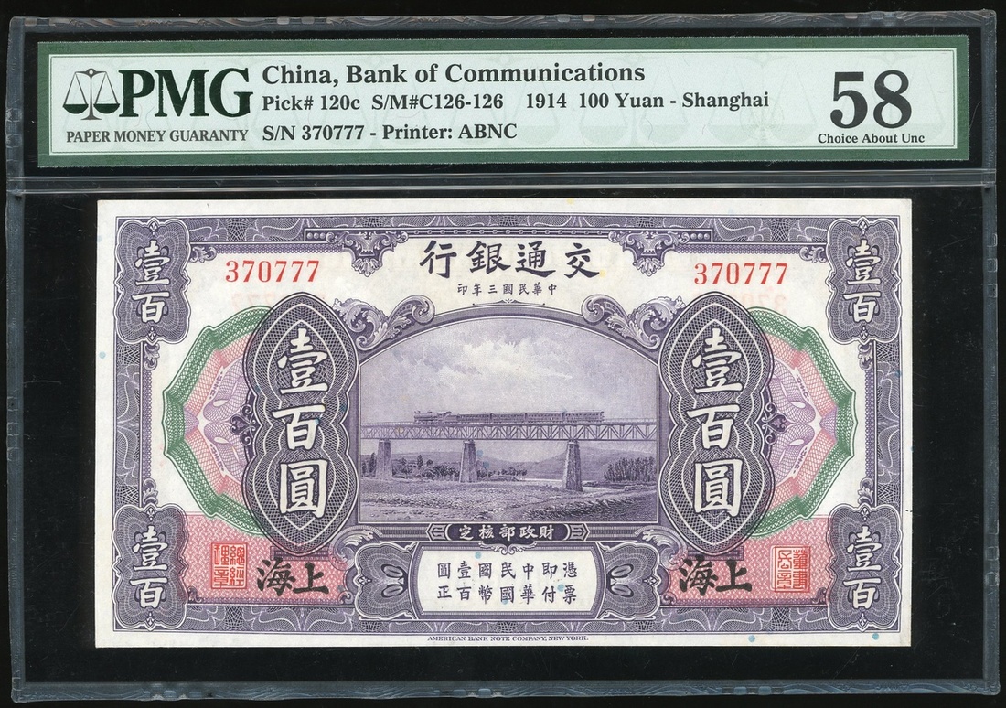 Bank of Communications, 100 Yuan, 1914, Shanghai, serial number 370777, purple and multicoloured, train at centre, (Pick 120c), PMG 58 Choice About Uncirculated