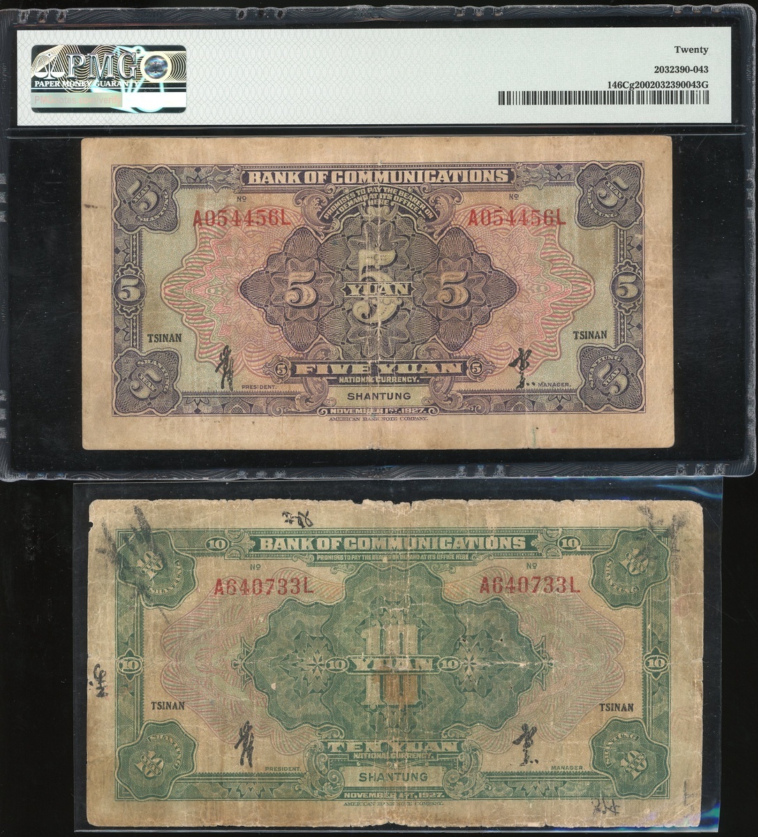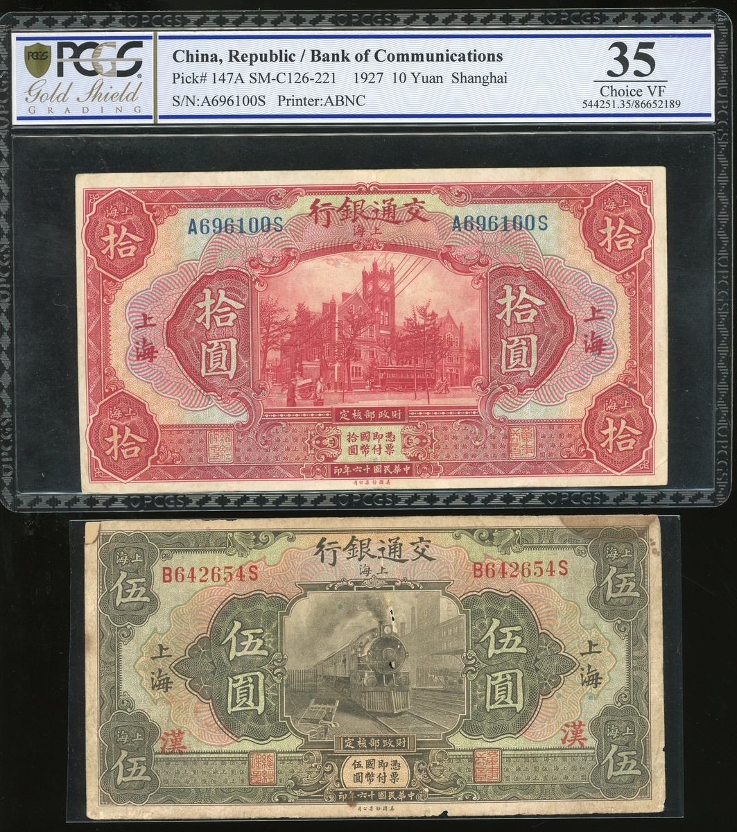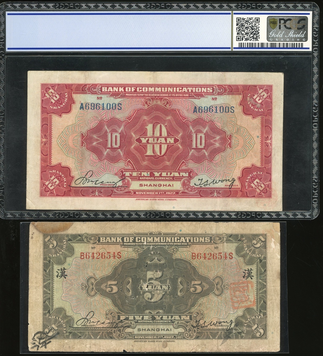 民國十六年(1927)交通銀行鈔票一組四枚,伍圓及拾圓,上海地名,編號B642654S及A696100S,和伍圓及拾圓,山東地名,編號A054456L及A640733L,上海拾圓評PCGS Gold Shield Grading 35,山東伍圓評PMG 20,其餘VF-F品相