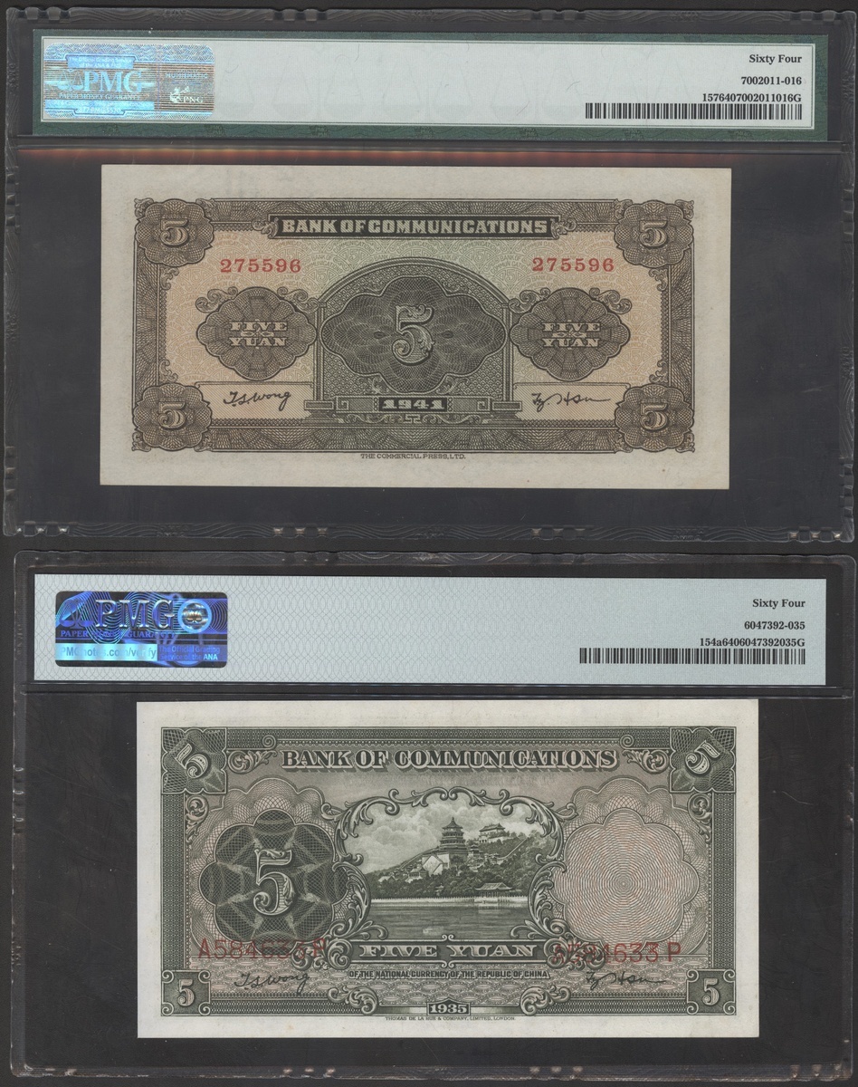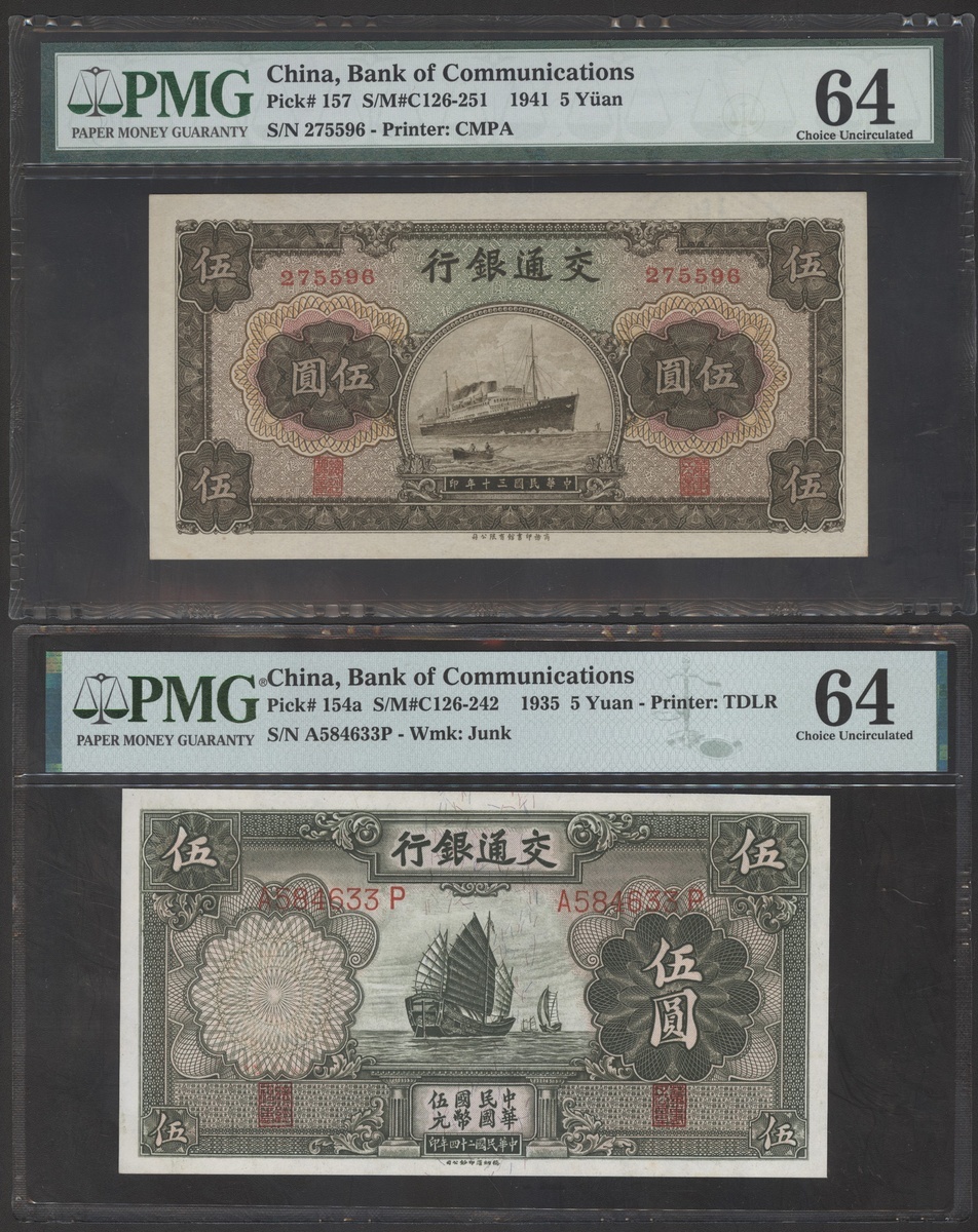 Bank of Communications, a group of 3x 5 yuan, 1914, 1935 and 1941, serial numbers SB653527U, A584633P and 275596, (Pick 117n, 154a and 157), all graded PMG 64 Choice Uncirculated (3)