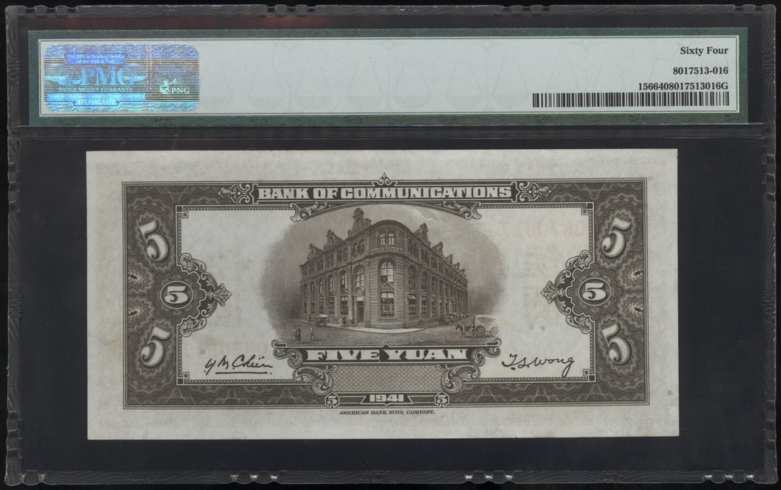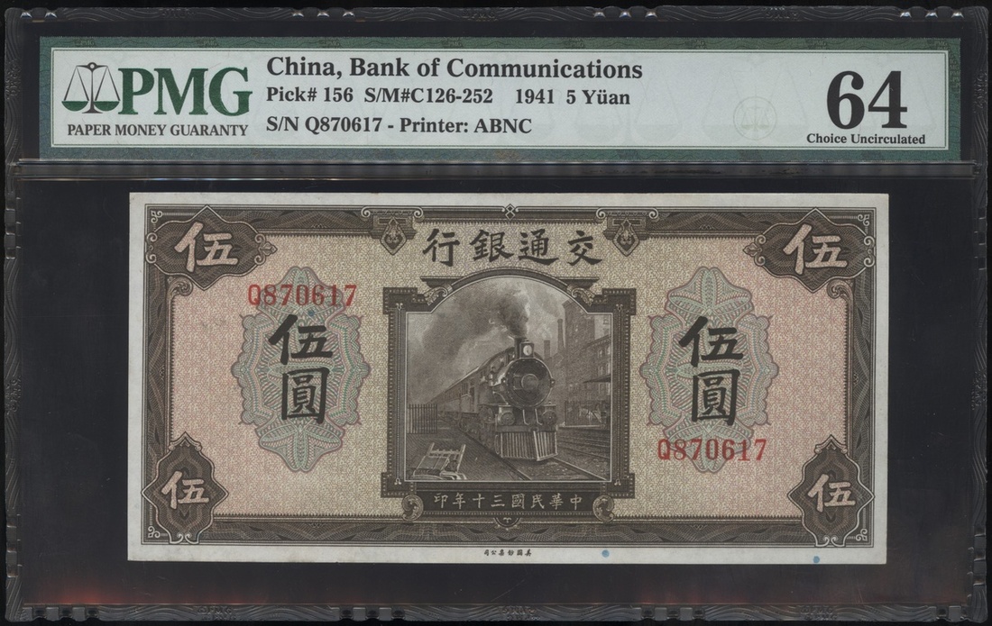 民國三十年交通銀行伍圓,編號Q870617,PMG 64